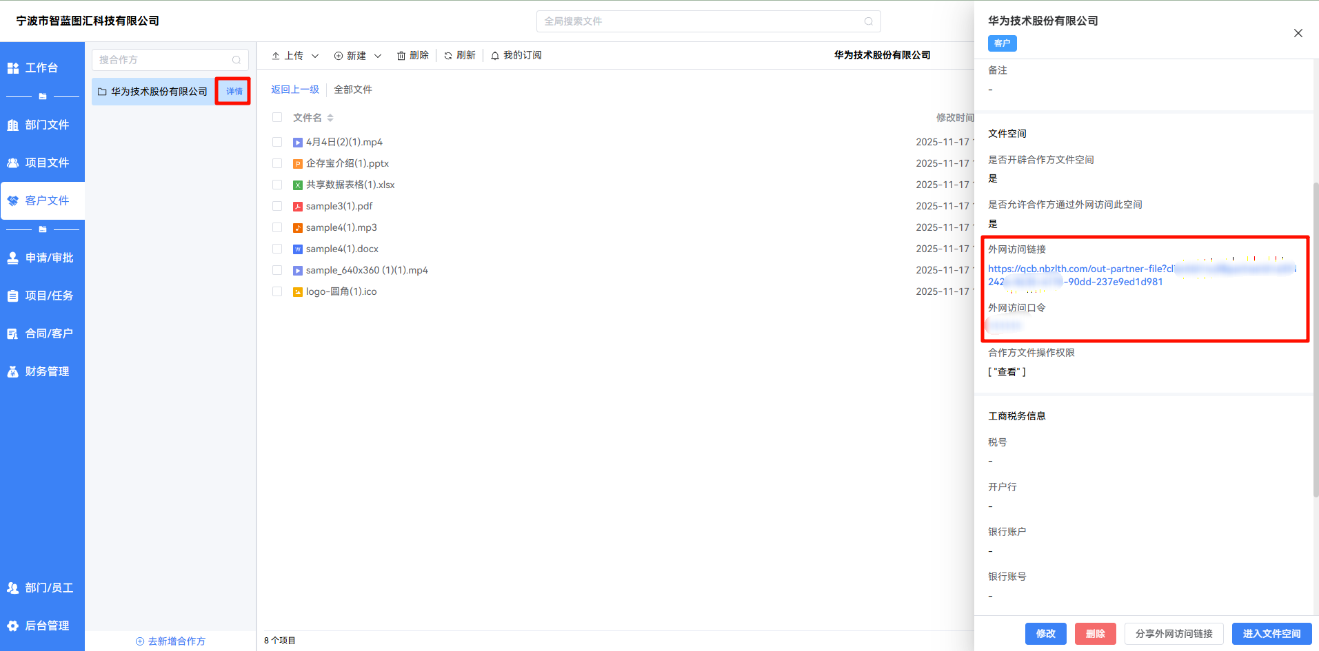 - 将外网访问链接和口令发送给客户(合作方)后,对方即可通过 浏览器实时访问该空间内的文件,无需登录企业内网。