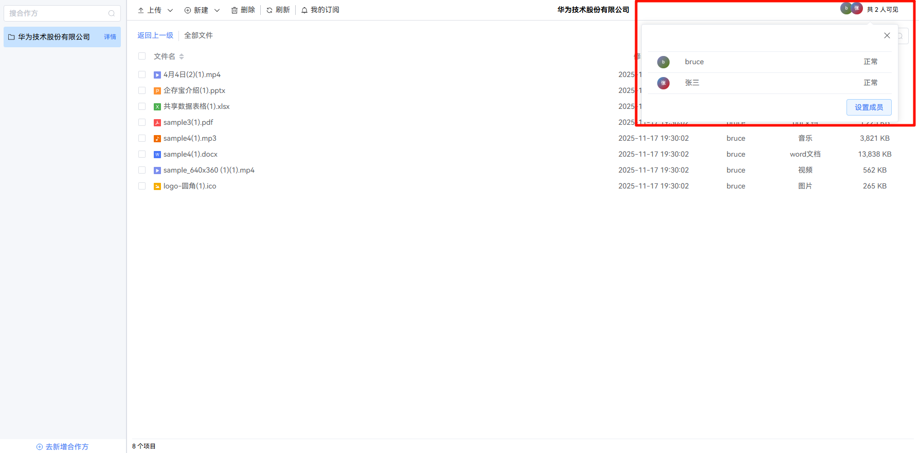 - 点击文件空间右上角的 人员头像,可添加或删除合作方文件共享成员。