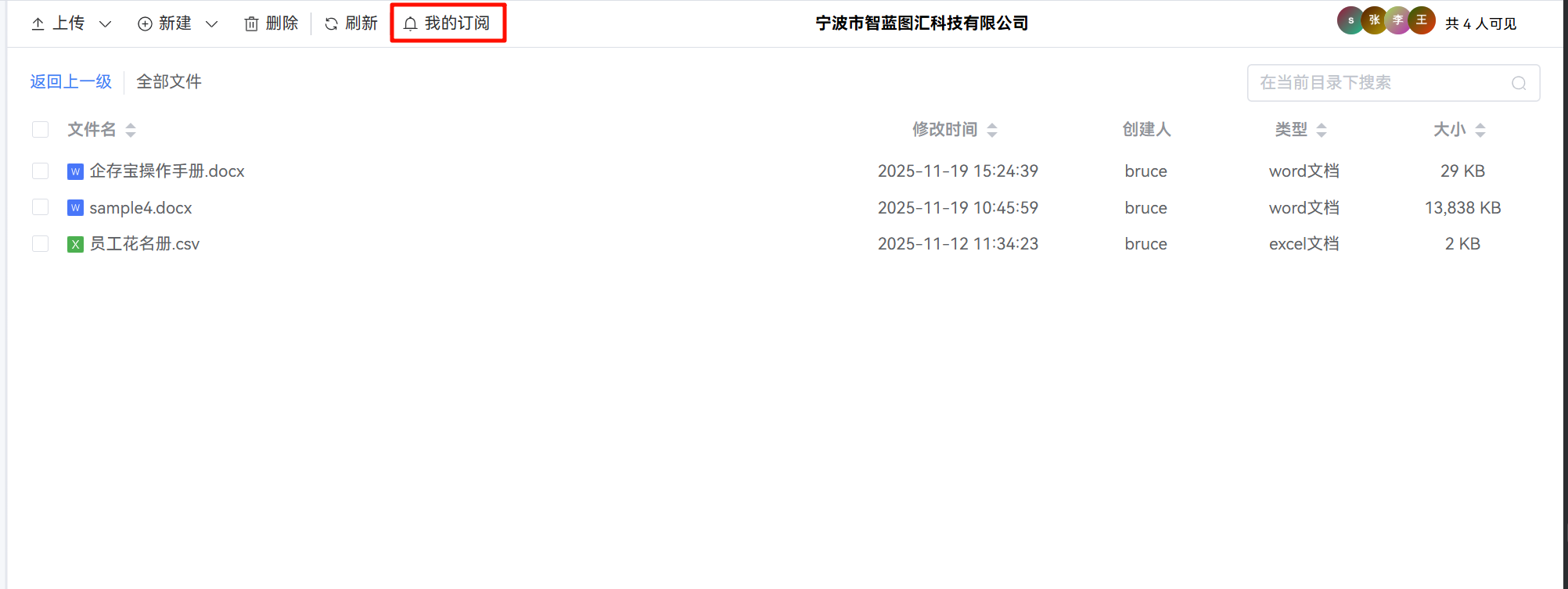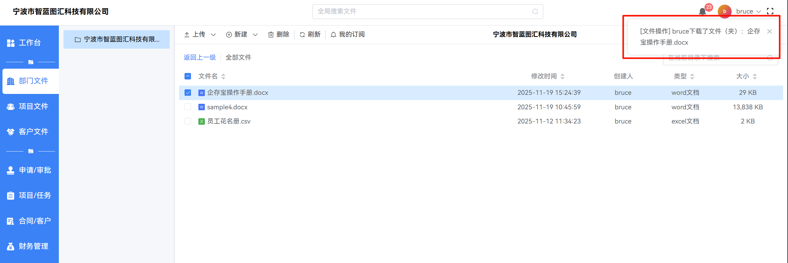 管理员或有权限的用户可以对文件或文件夹进行订阅,用于 实时监控 关键资料的 变更情况。当订阅对象发生任何操作(上传、修改、下载、删除等),系统会 立即通知 订阅者,帮助及时发现异常访问、恶意下载或外发行为,从而 保障敏感数据安全。