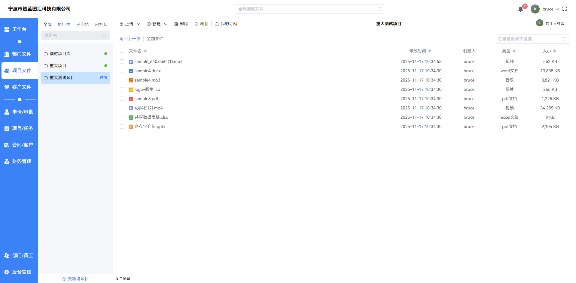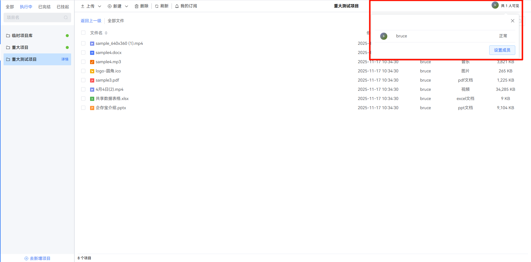 添加成员后,该员工可访问此项目文件空间中的所有文件。