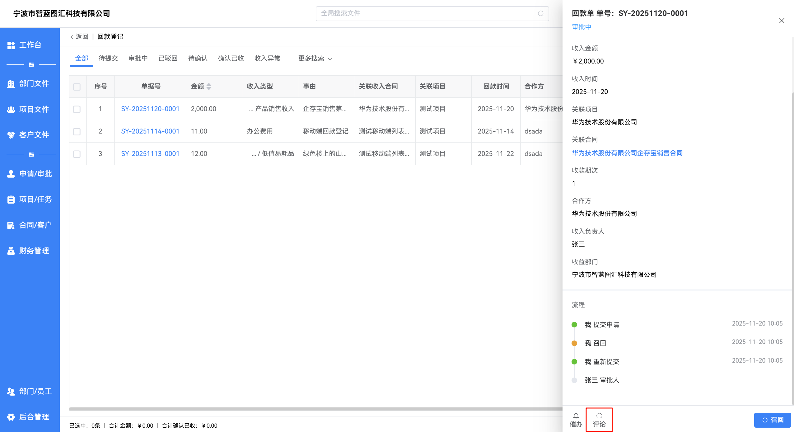 在回款单详情页底部点击 评论 按钮,可对单据进行评论,便于沟通与协作。