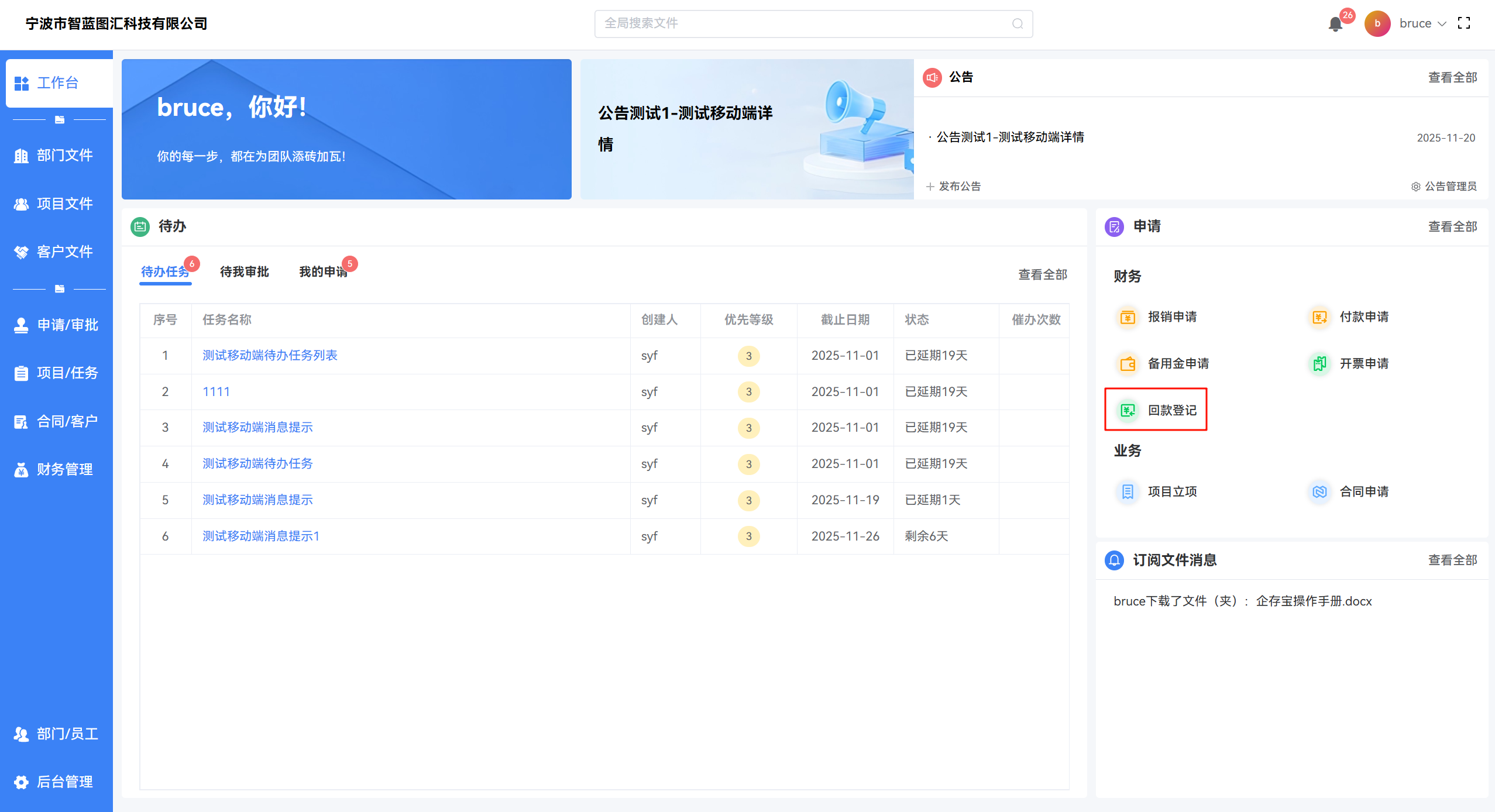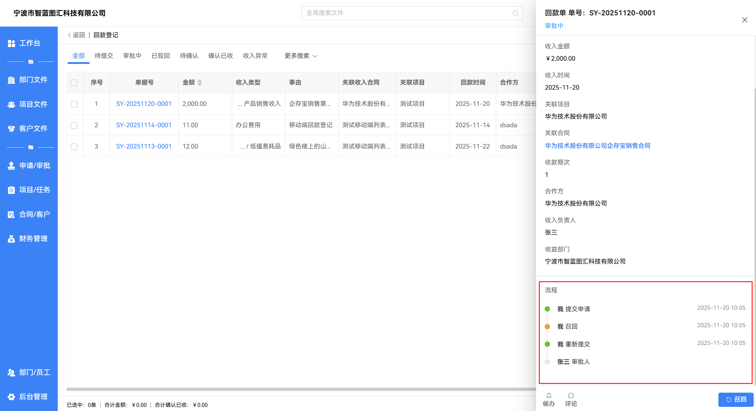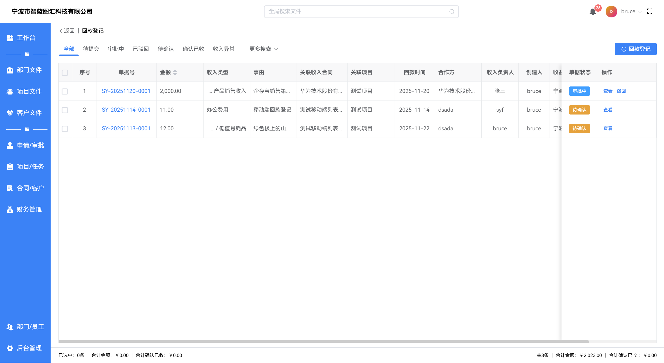 - 通过 【申请/审批 -> 回款登记】 进入列表页,可查看自己提交的所有回款登记单及单据状态。