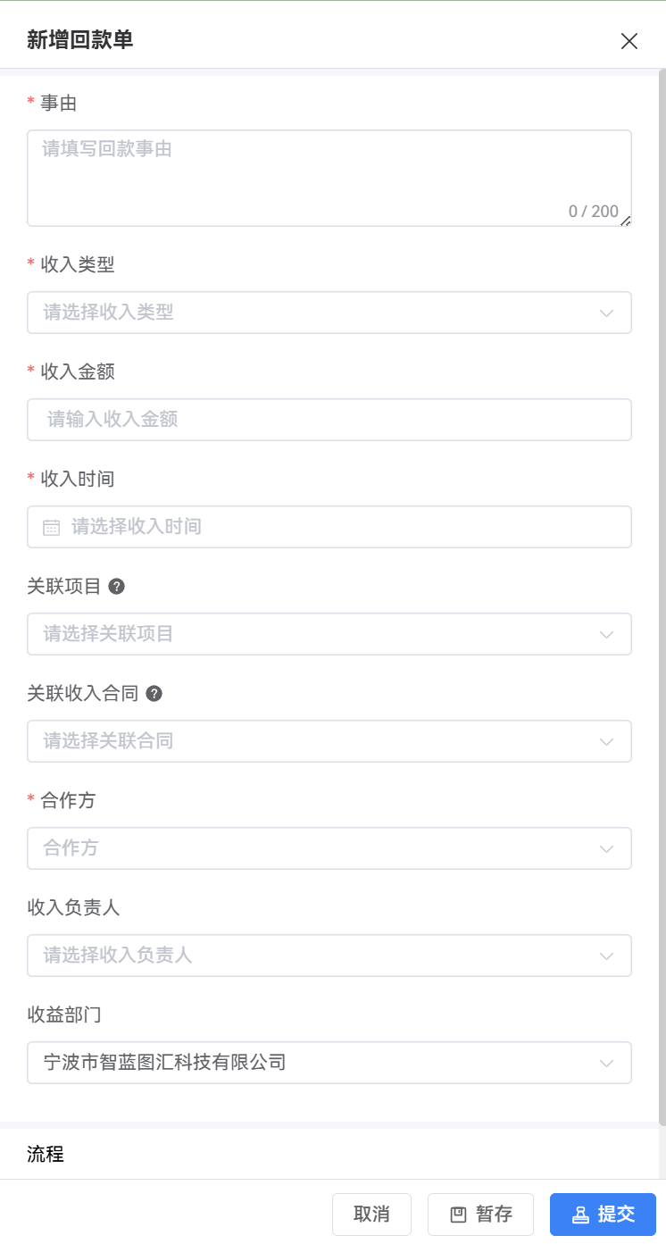 1、填写回款信息,如回款事由,收入金额,收入时间,合作方,关联合同等。