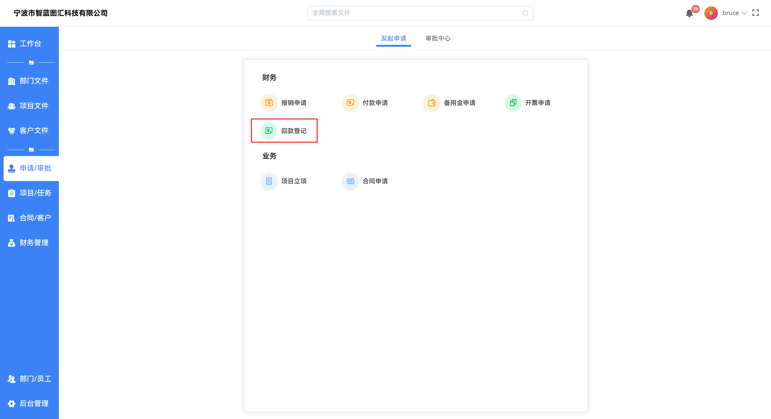 【申请/审批 -> 回款登记】