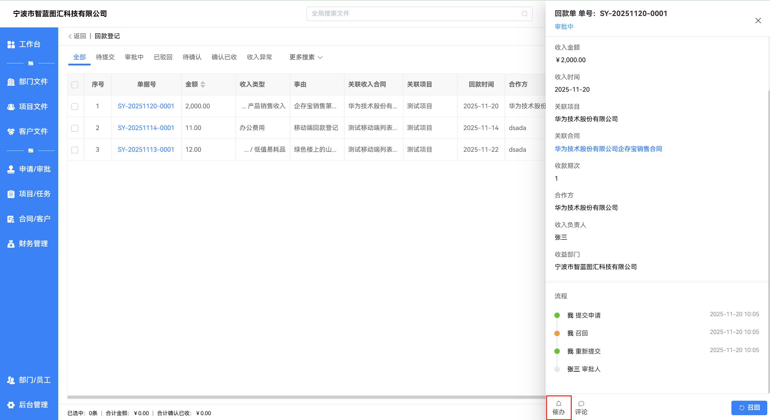 如审批人未及时处理,提交人可在回款单详情页底部点击 催办 按钮,提醒当前审批人尽快审批。