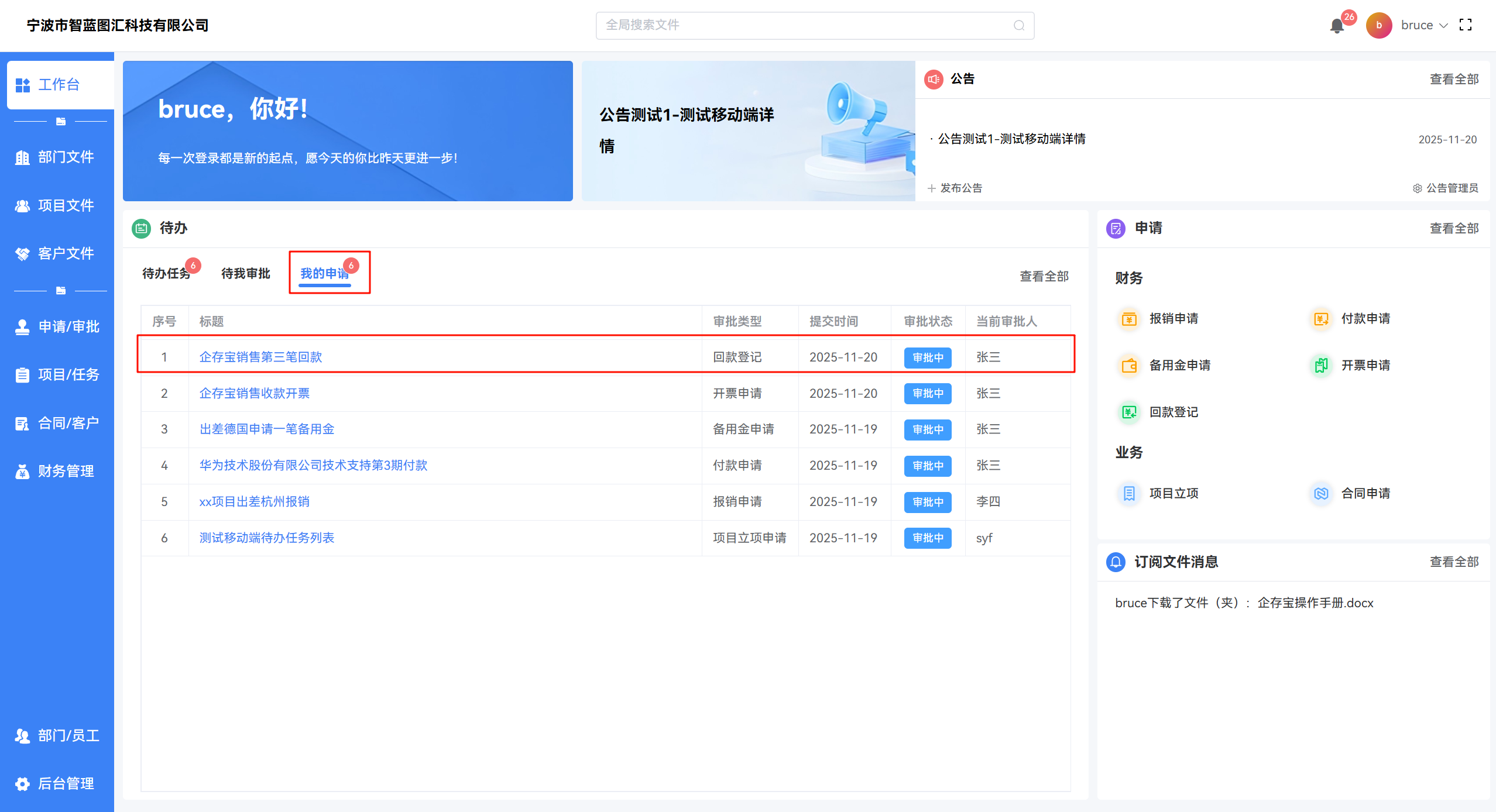 - 通过 【工作台 -> 我的申请】 可便捷查看当前尚未审批完成的开票单。