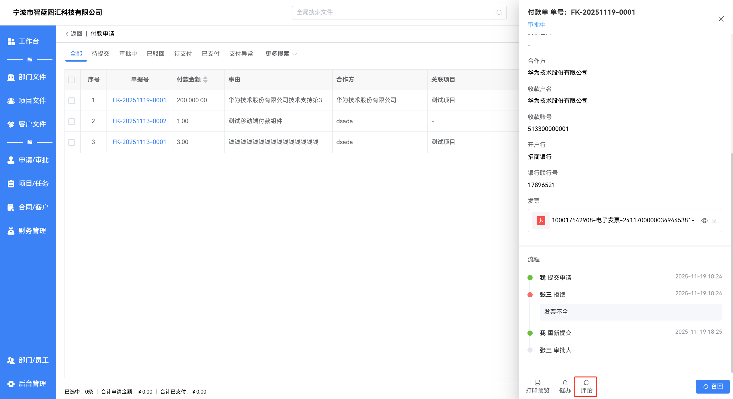 在付款单详情页底部点击 评论 按钮,可对单据进行评论,便于沟通与协作。