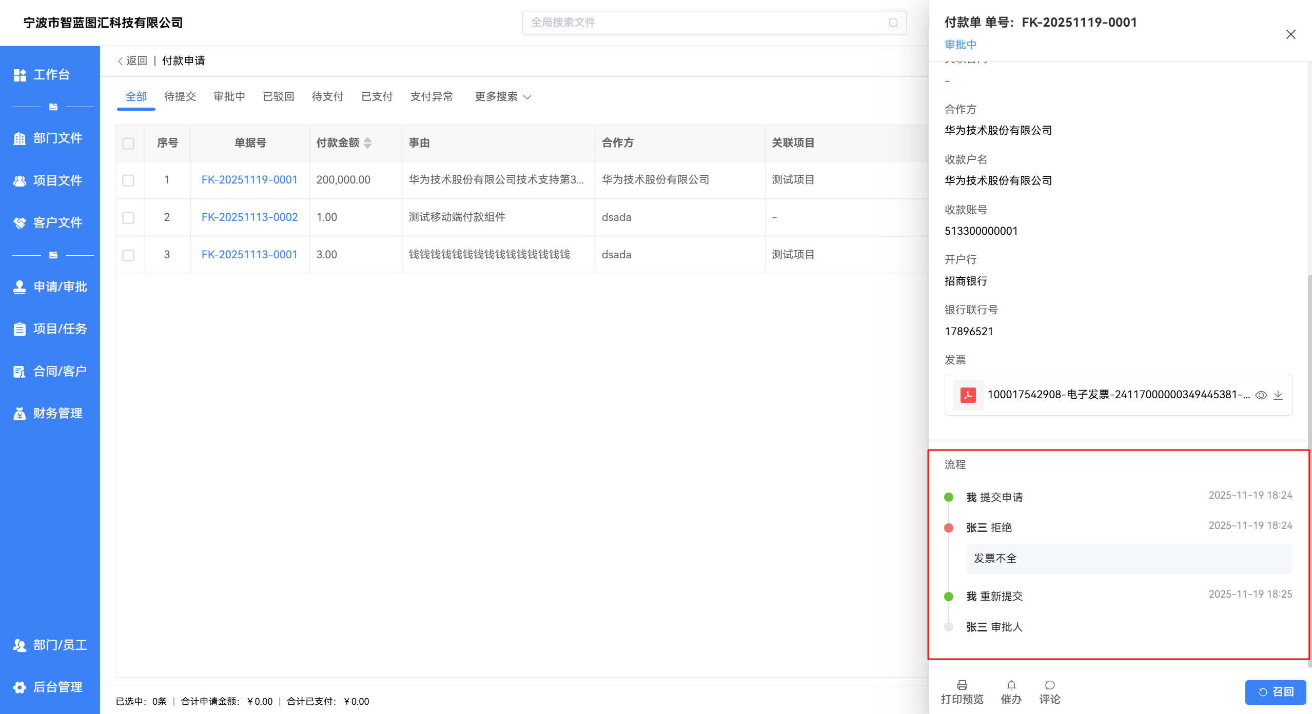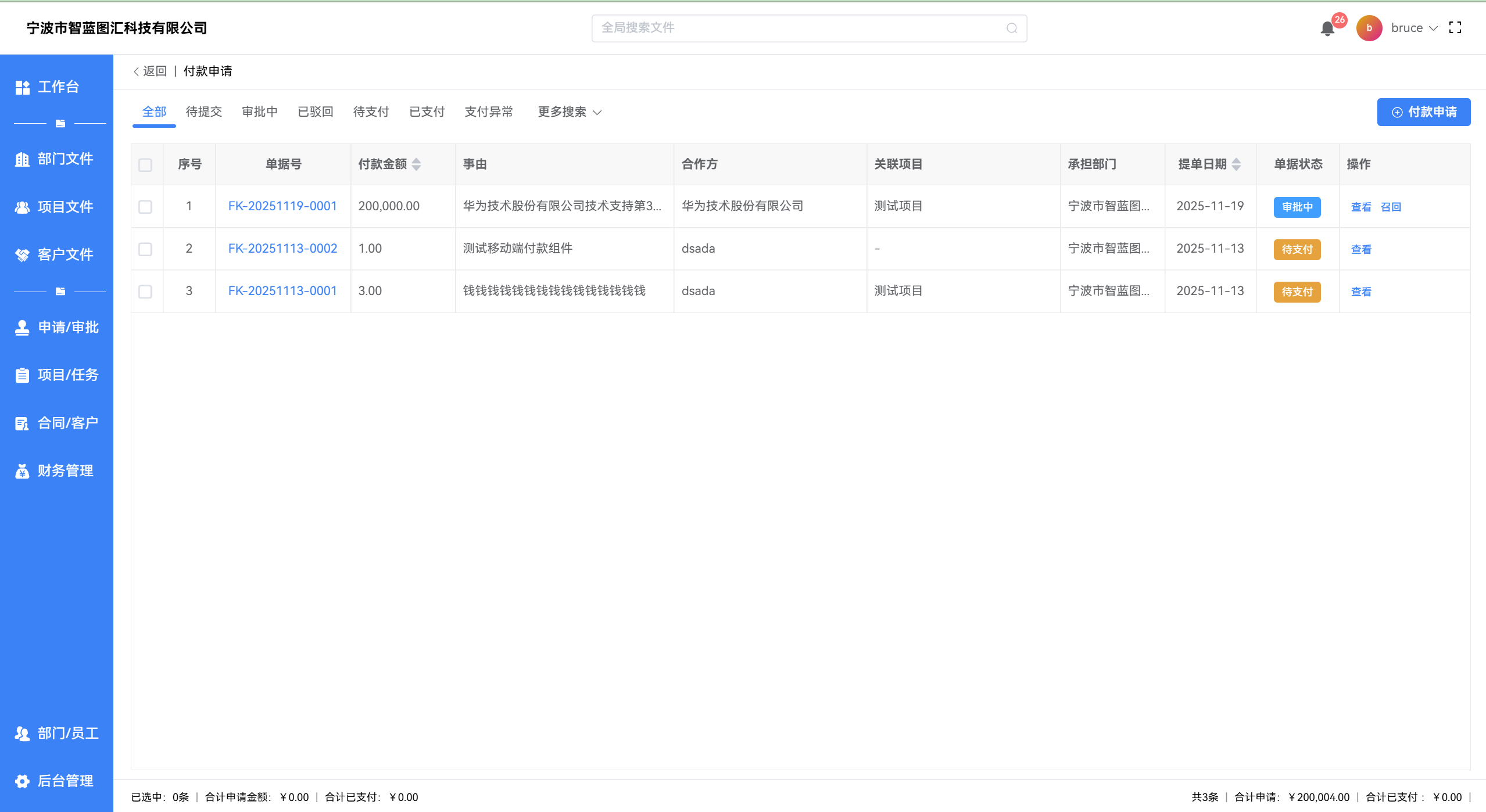 - 通过 【申请/审批 -> 付款申请】 进入列表页,可查看自己提交的所有付款申请及单据状态。