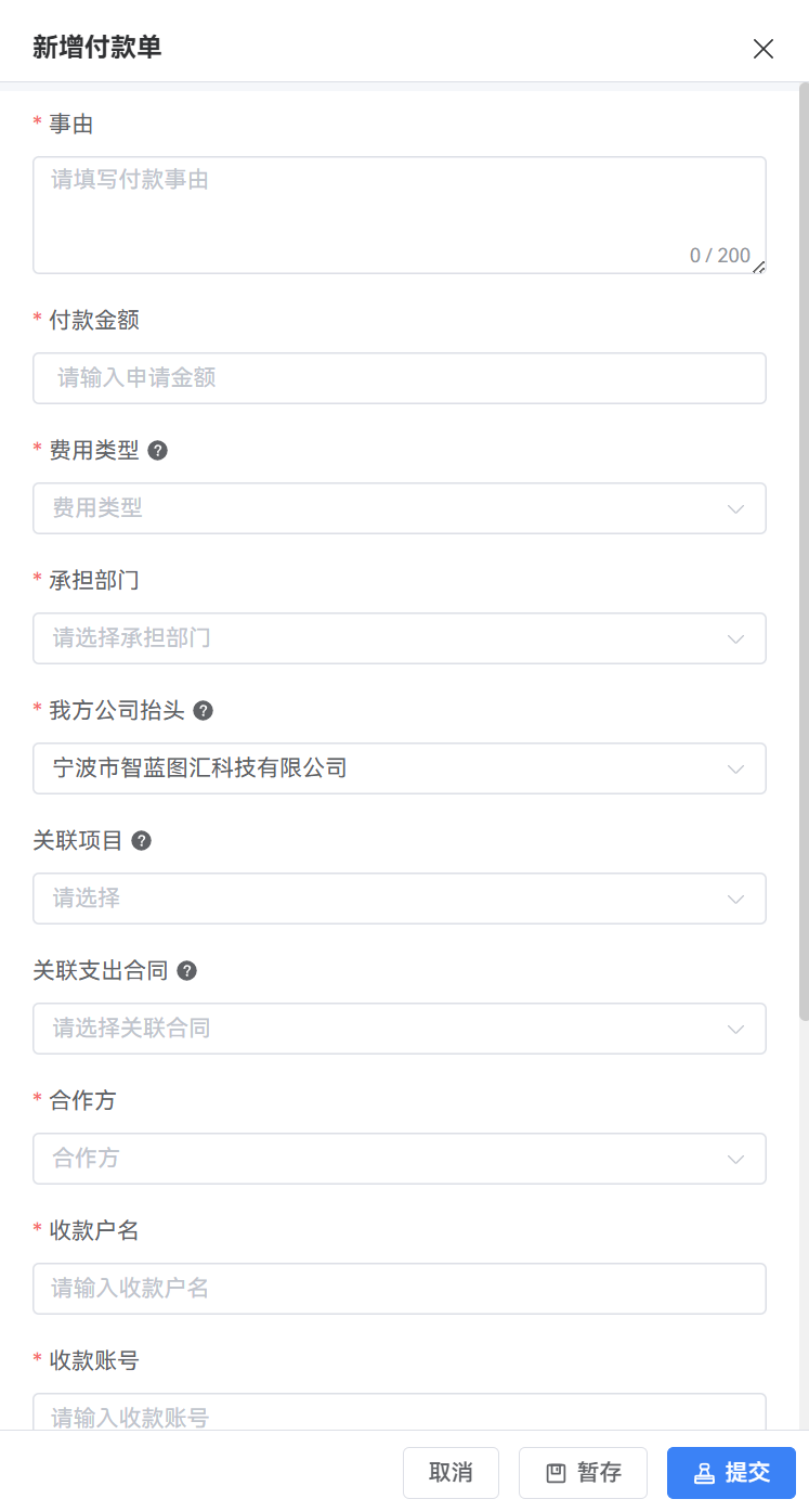 1、填写付款单信息,如付款金额,合作方,费用类型,公司抬头,相关附件等。