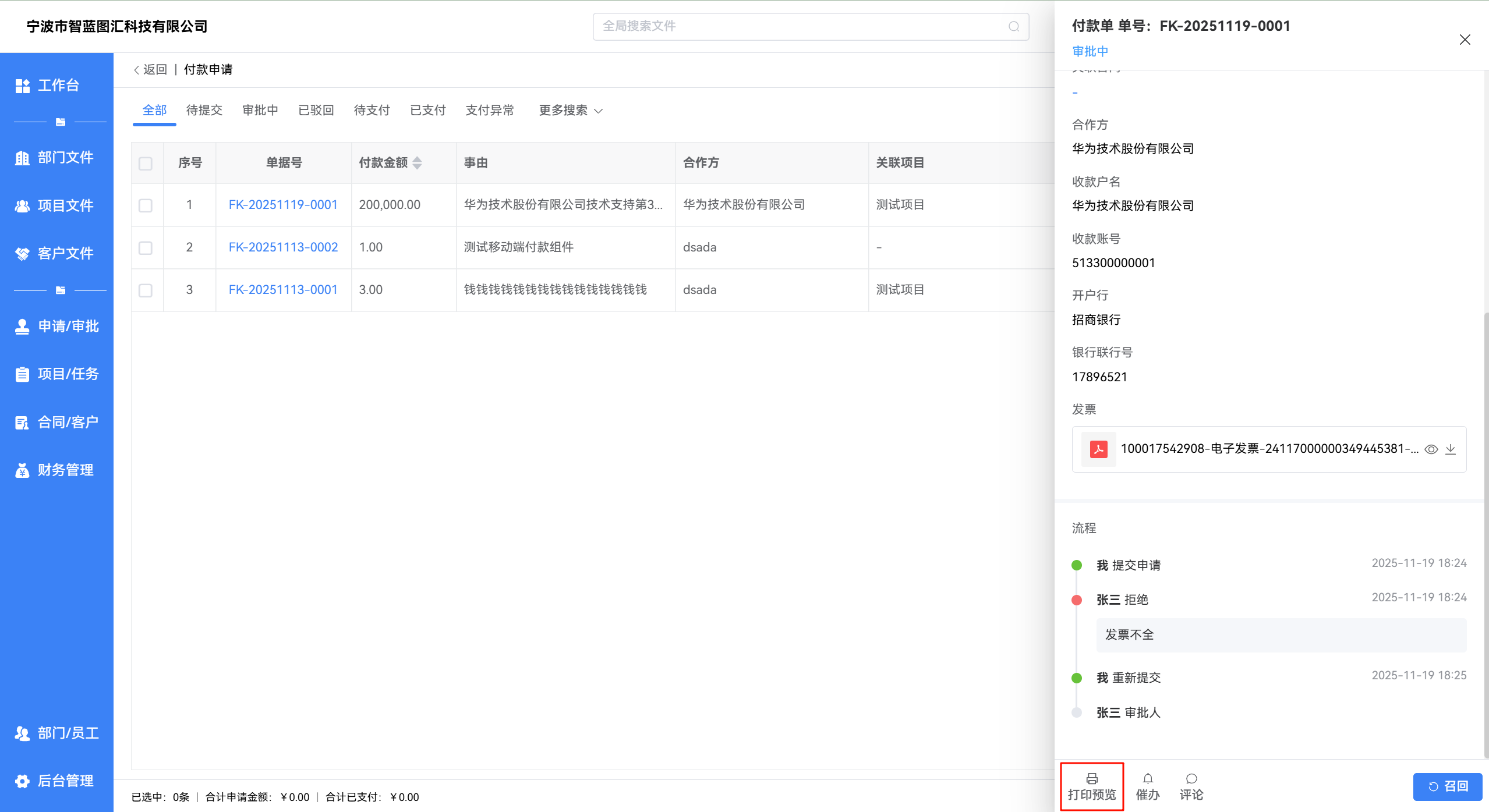 付款申请模块用于企业内部提交 对外付款申请,包括 供应商付款、合同款支付 等。系统支持审批流程、催办、评论和打印单据,便于财务管理和资金安全控制。