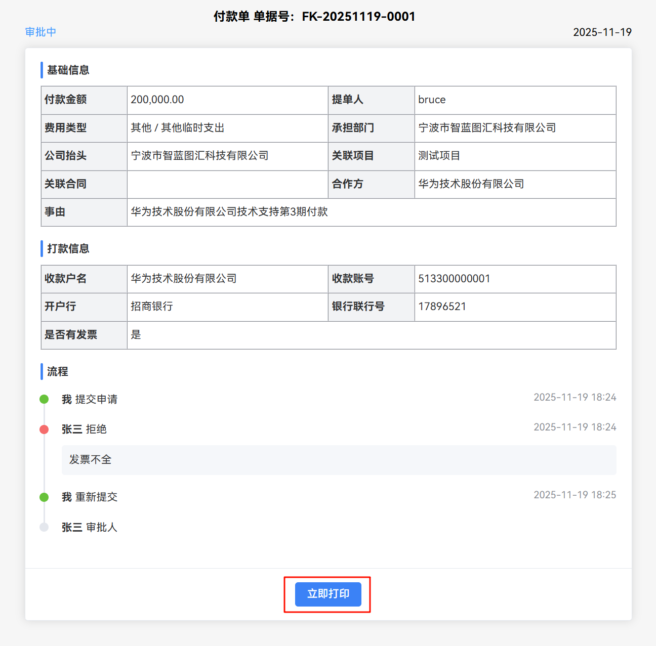 - 在生成的付款单预览页面点击 立即打印 按钮。