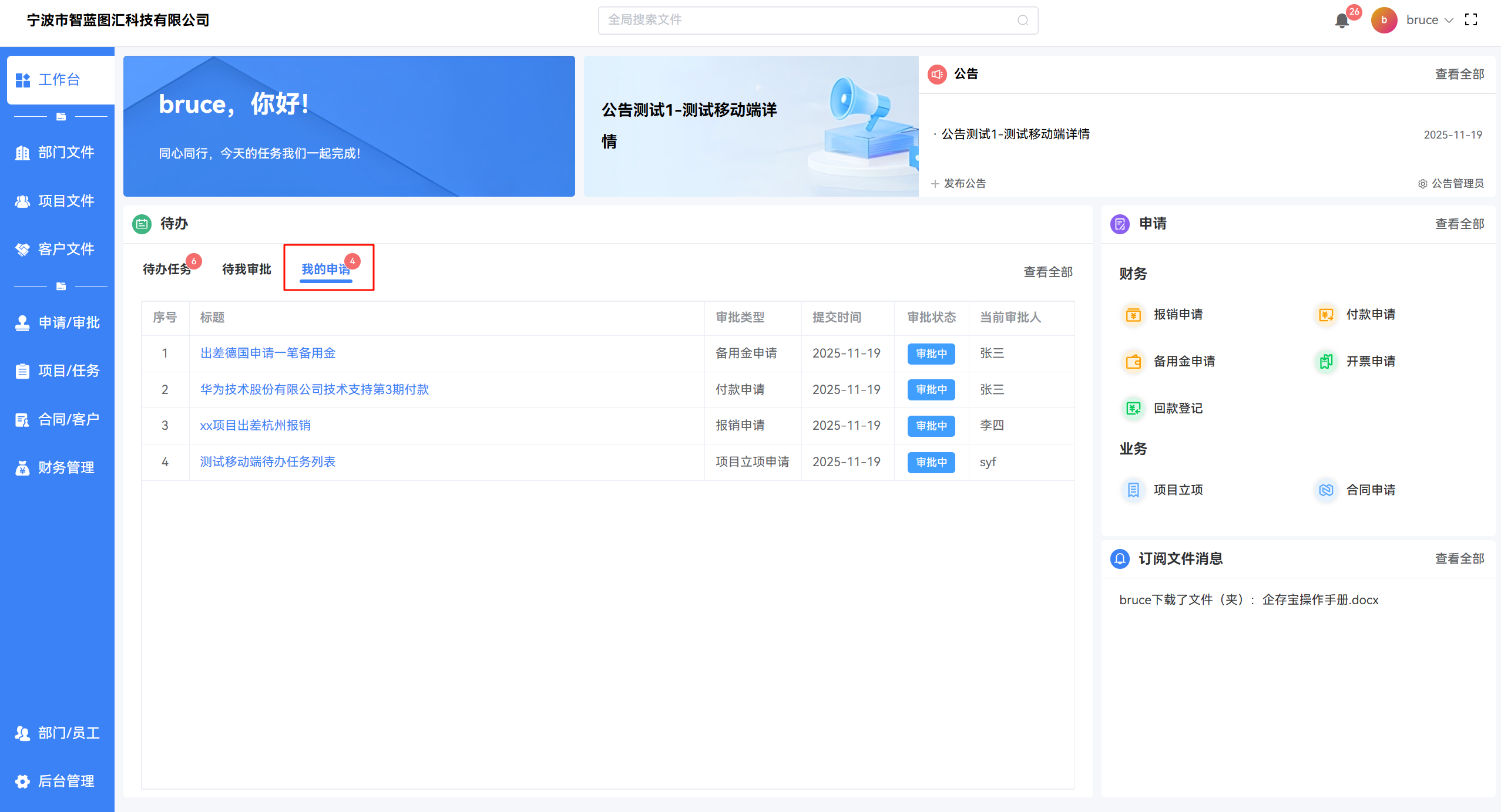 3、提交后,系统会立即发送消息给审批人进行审批。