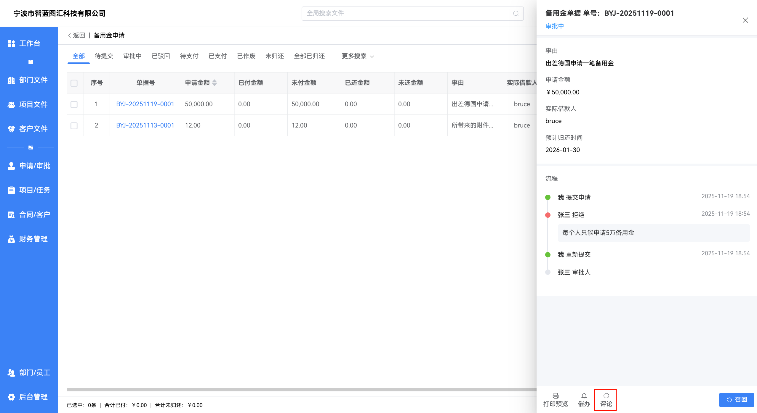在备用金借款单详情页底部点击 评论 按钮,可对单据进行评论,便于沟通与协作。