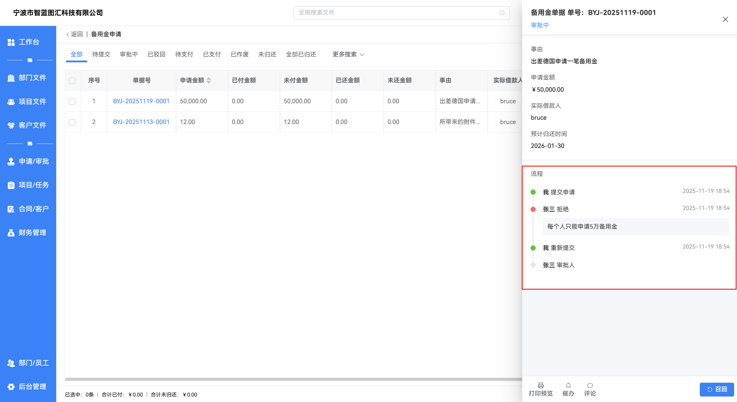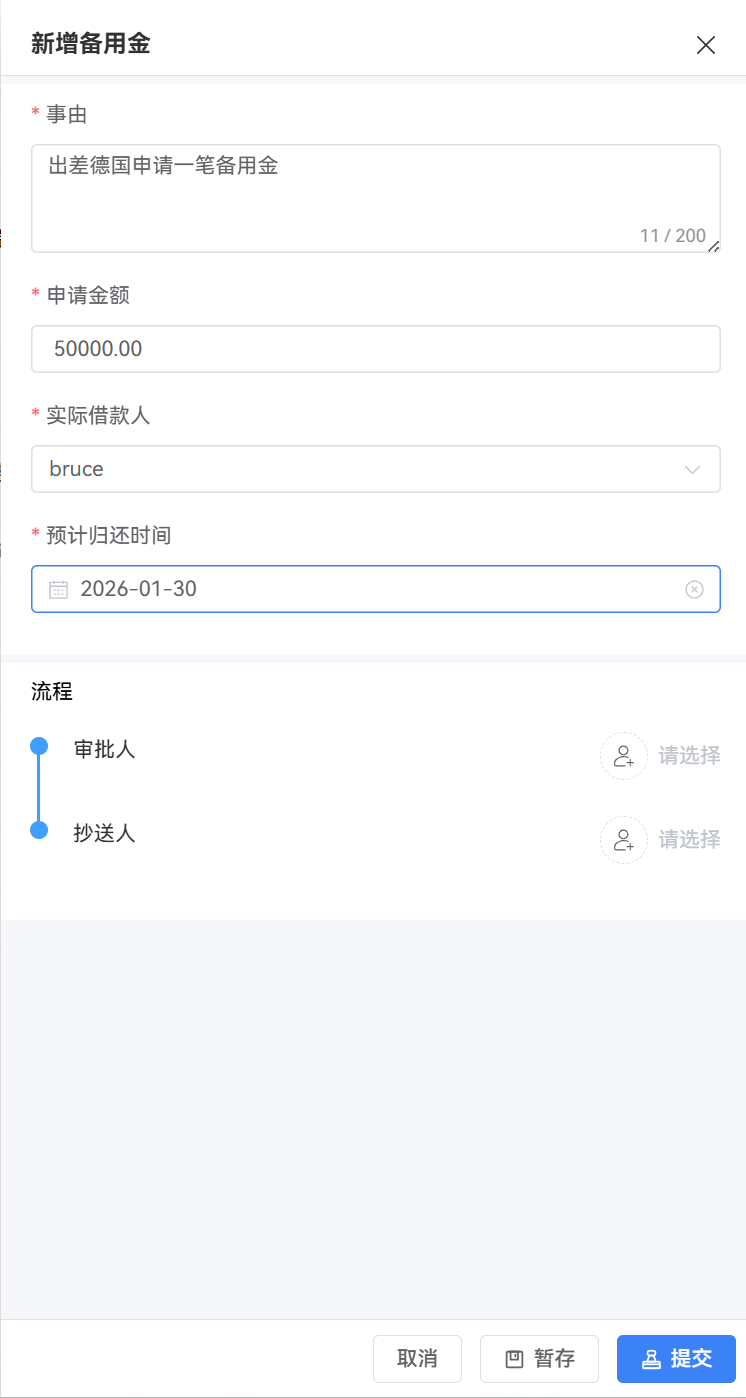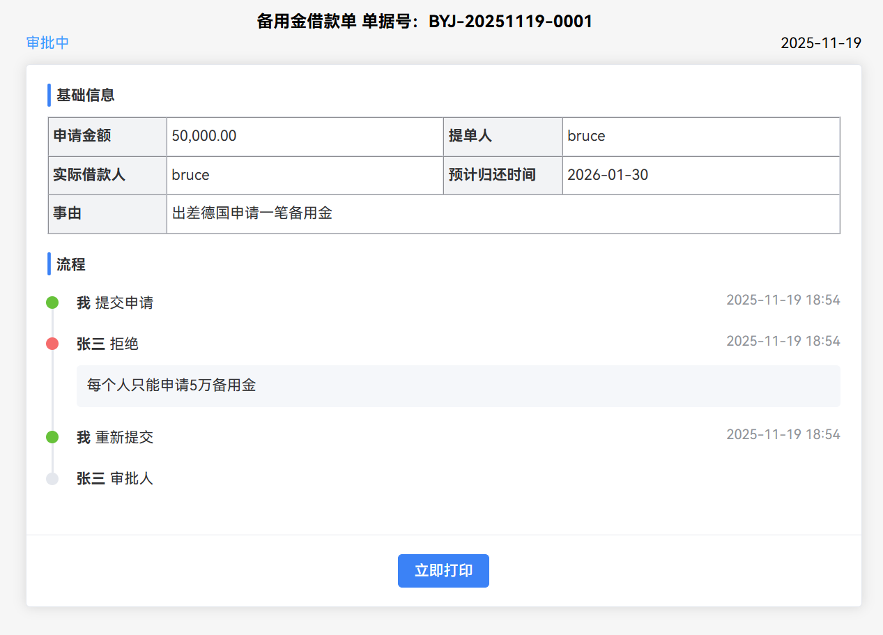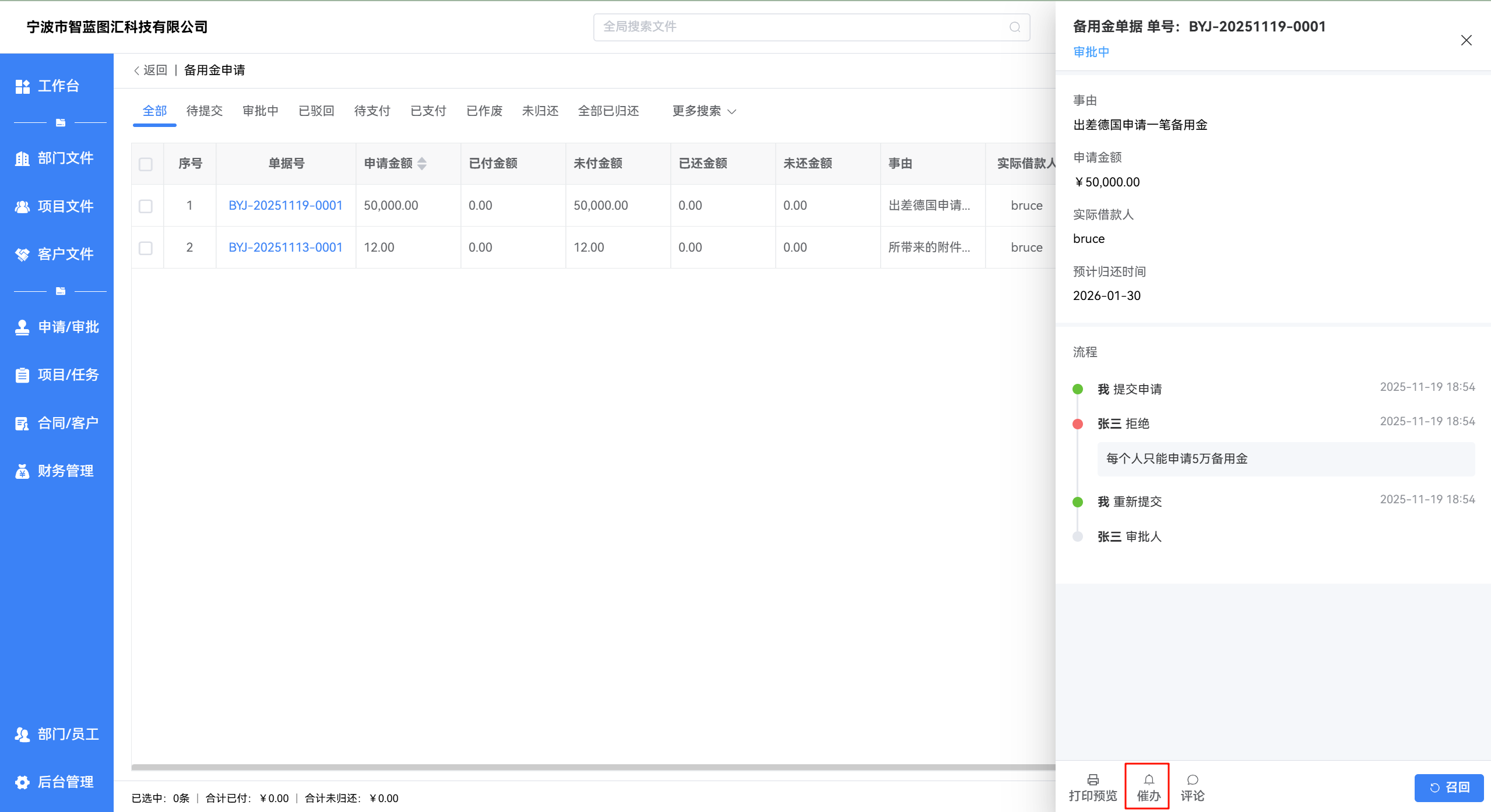 备用金申请模块用于员工申请内部借款或临时资金使用,支持 审批流程、催办、评论及打印单据,便于企业 内部借款 管理和审核控制。