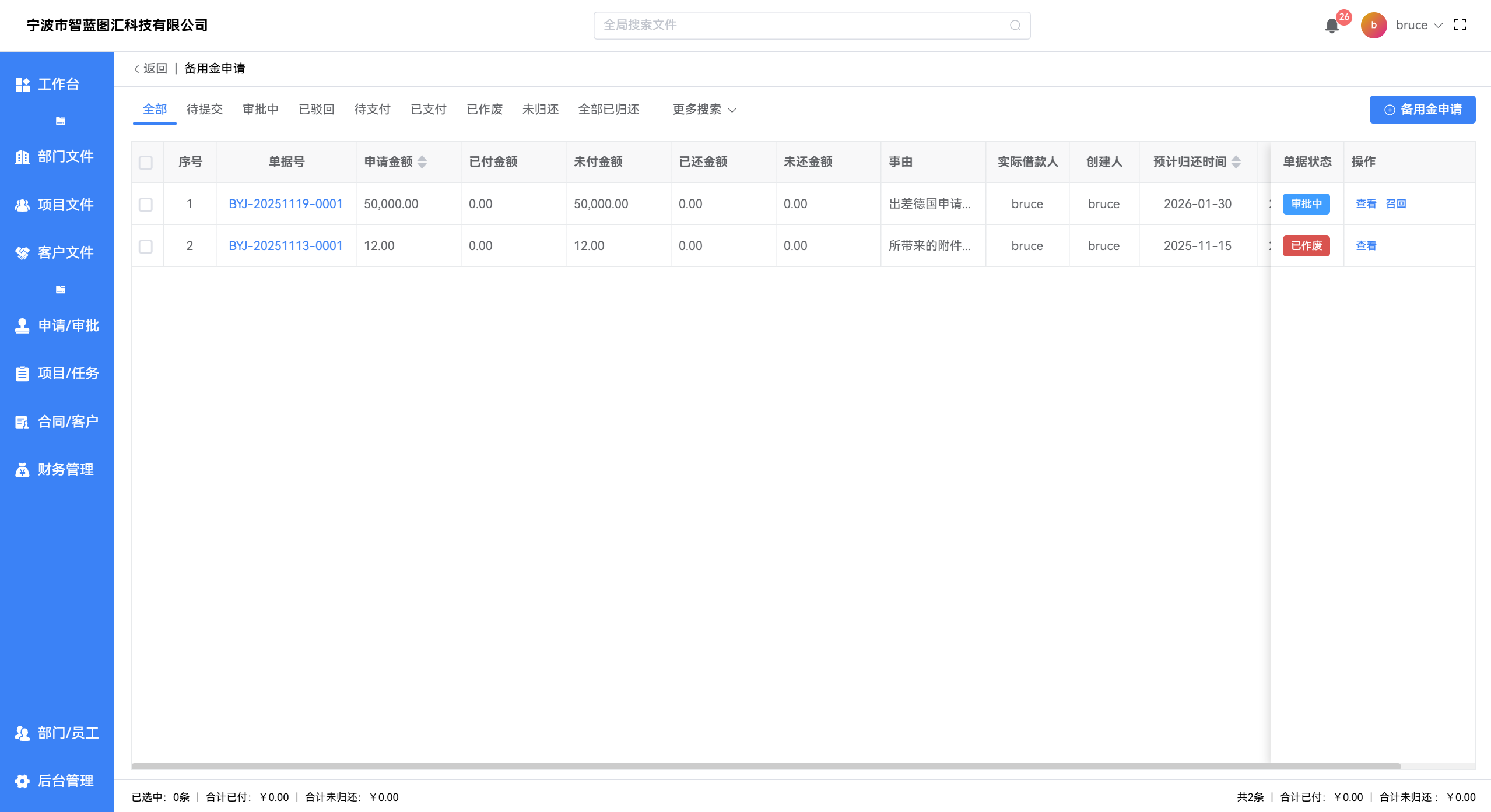 - 通过 【申请/审批 -> 备用金申请】 进入列表页,可查看自己提交的所有备用金申请、单据状态、以及目前未归还的备用金金额。