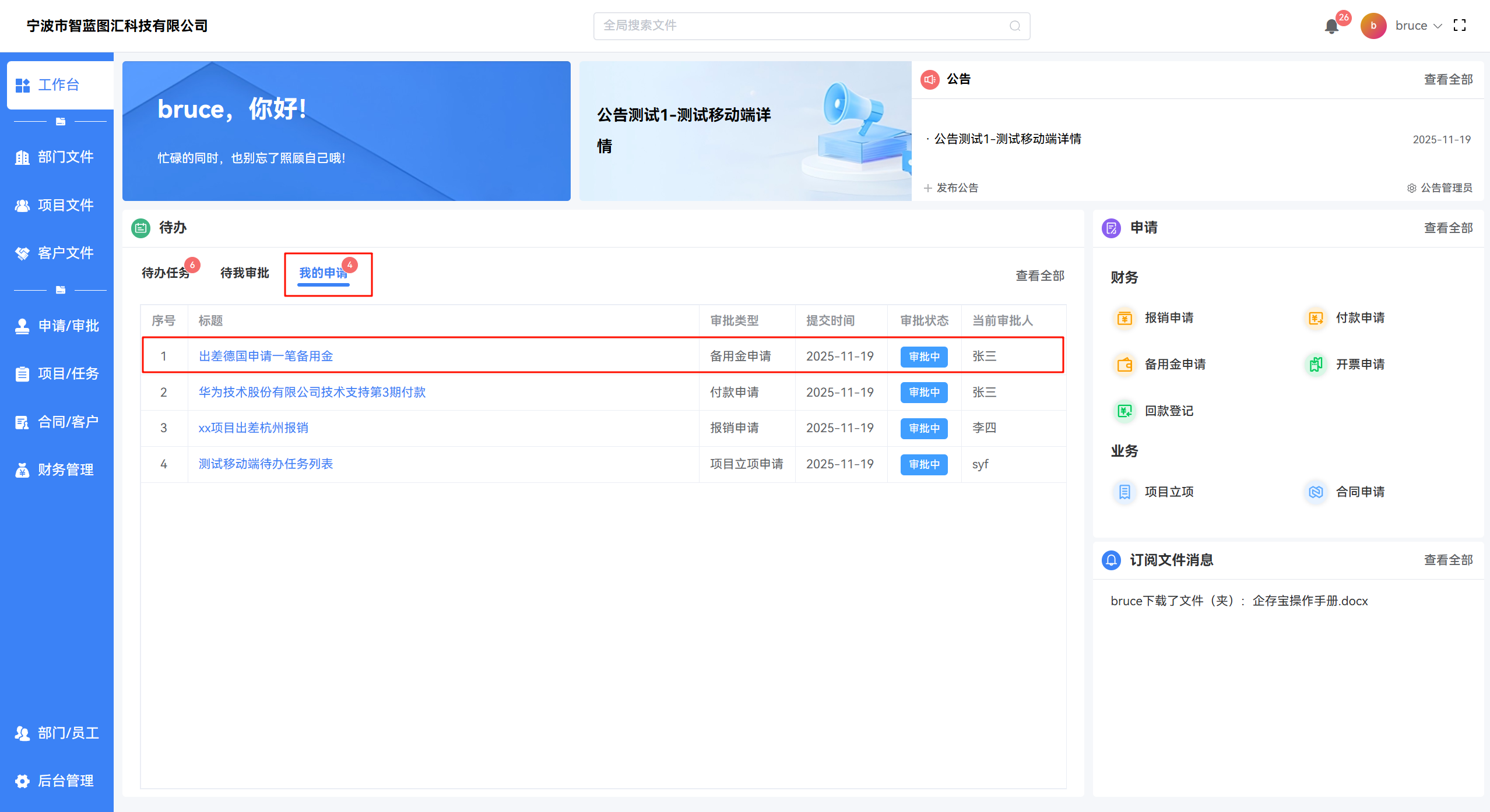- 通过 【工作台 -> 我的申请】 可便捷查看当前尚未审批完成的付款单。