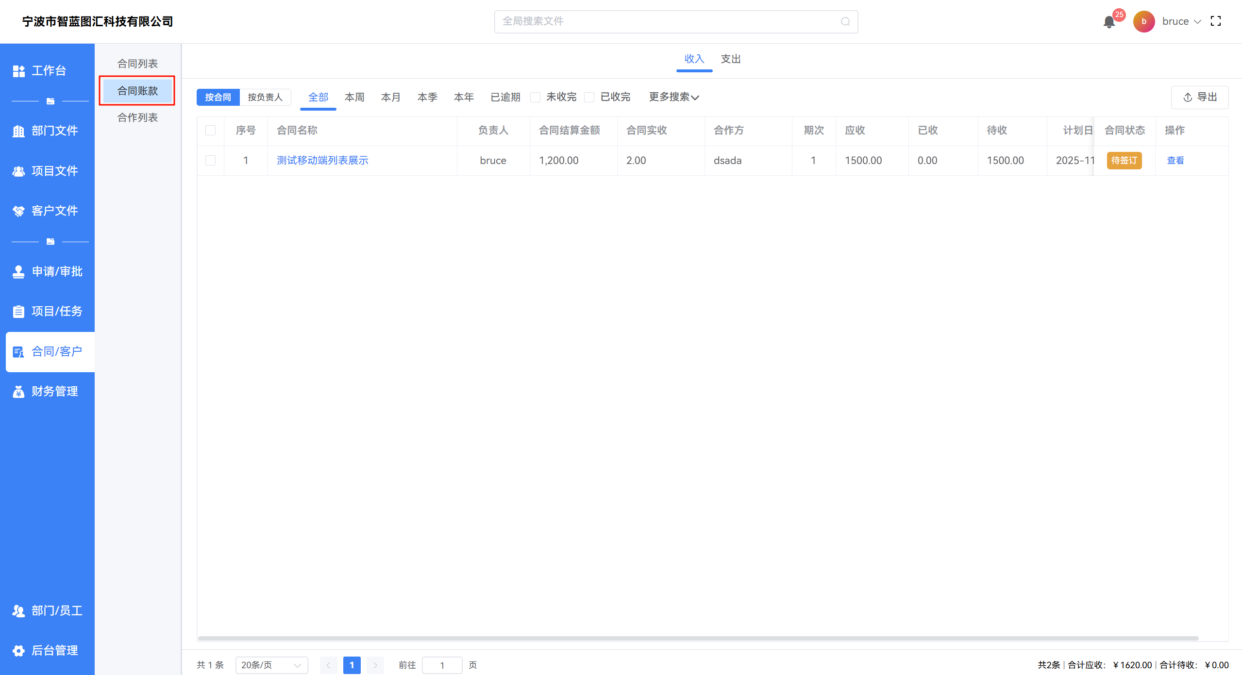 - 账款查看:按合同或负责人查看应收账款或应付账款