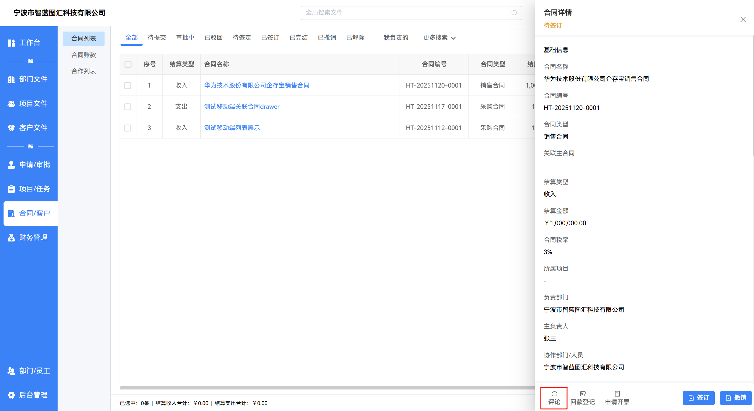 在合同详情页底部点击 评论 按钮,可对单据进行评论,便于沟通与协作。