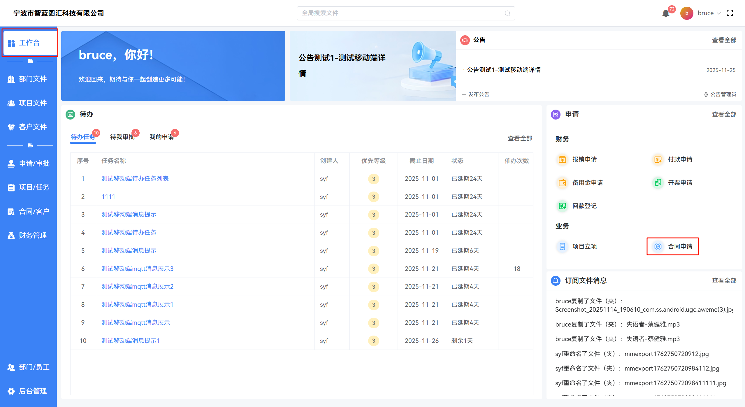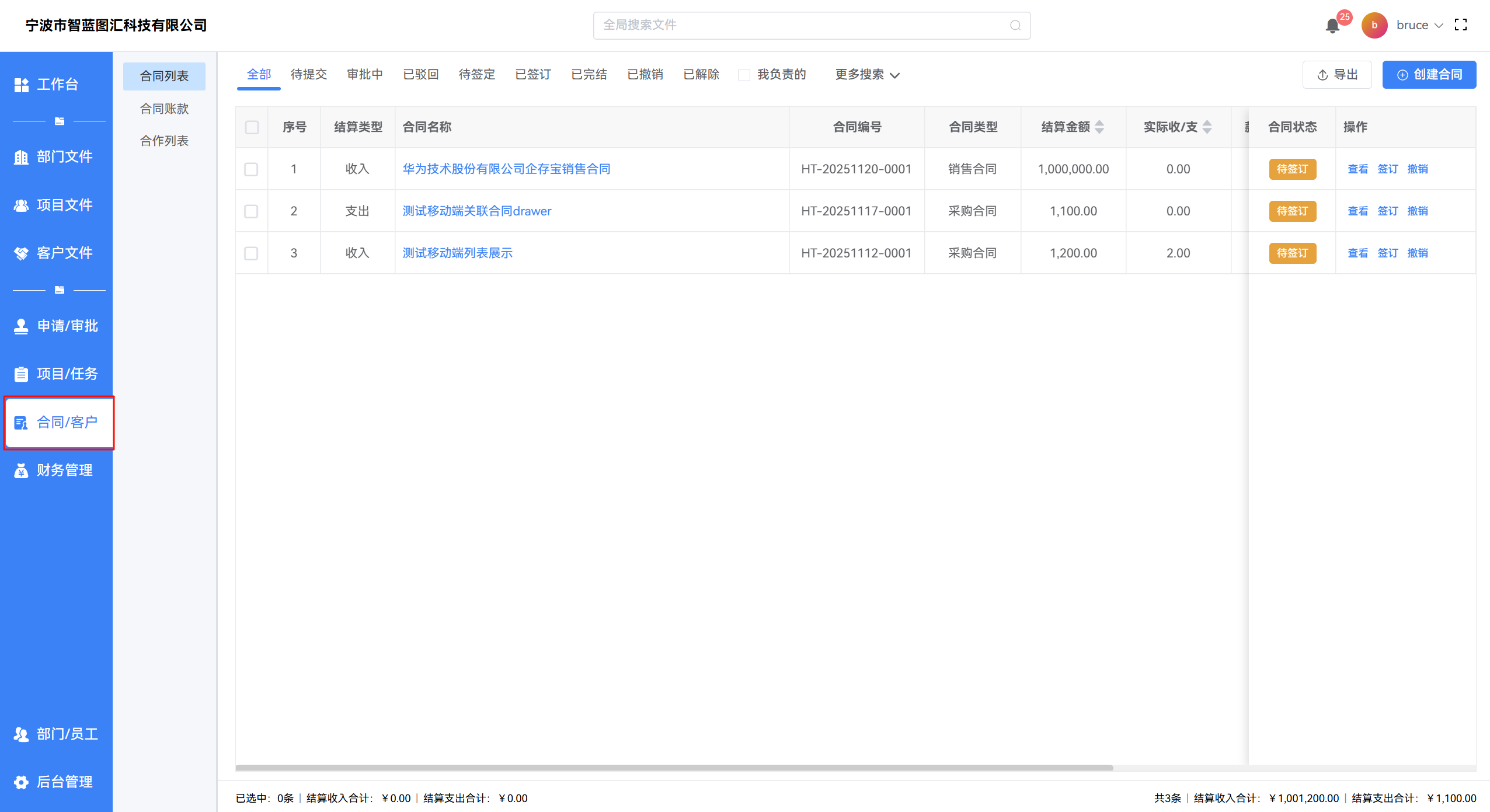 合同管理模块用于 统一管理公司所有合同的申请、审批、执行、归档以及账款跟踪。通过系统化管理,管理人员能够清晰掌握合同执行情况、收付款状态、开票情况和审批流程,确保合同管理规范、透明、高效。