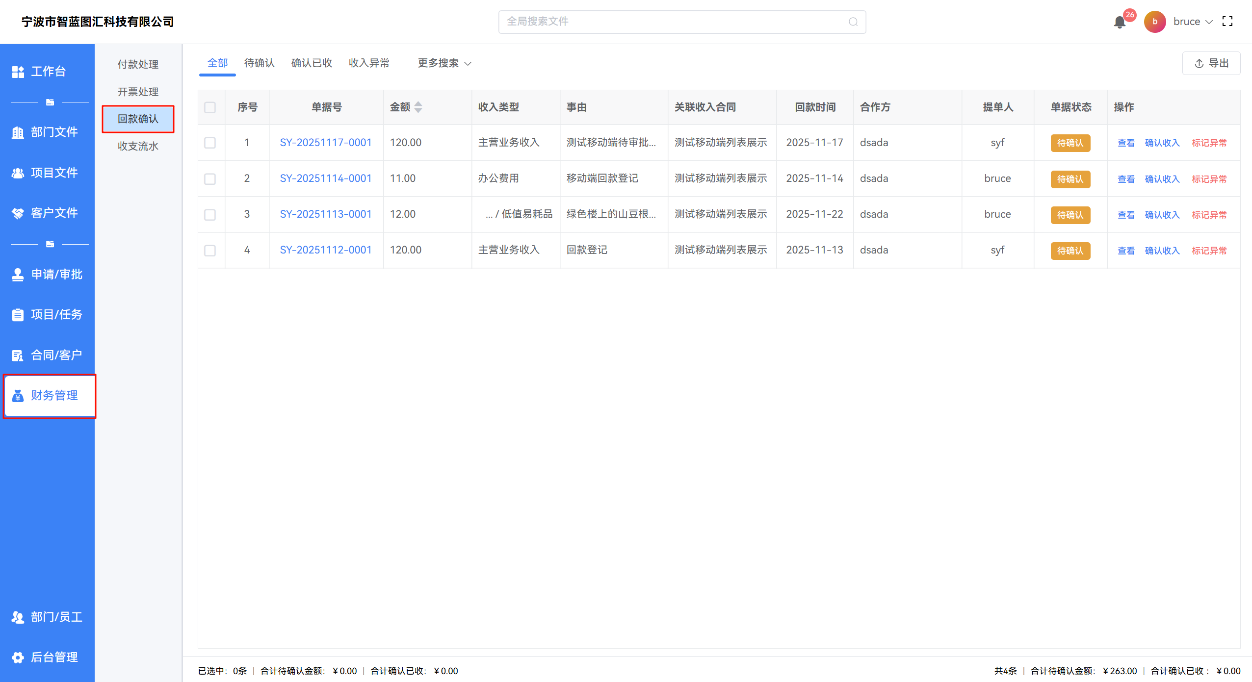 - 状态统计:列表底部自动统计汇总 待确认、已确认金额, 方便管理者实时掌握公司回款情况