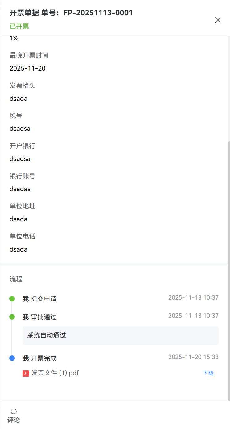- 记录开票时间、操作人及发票附件,并展示在单据详情页的 流程 板块中