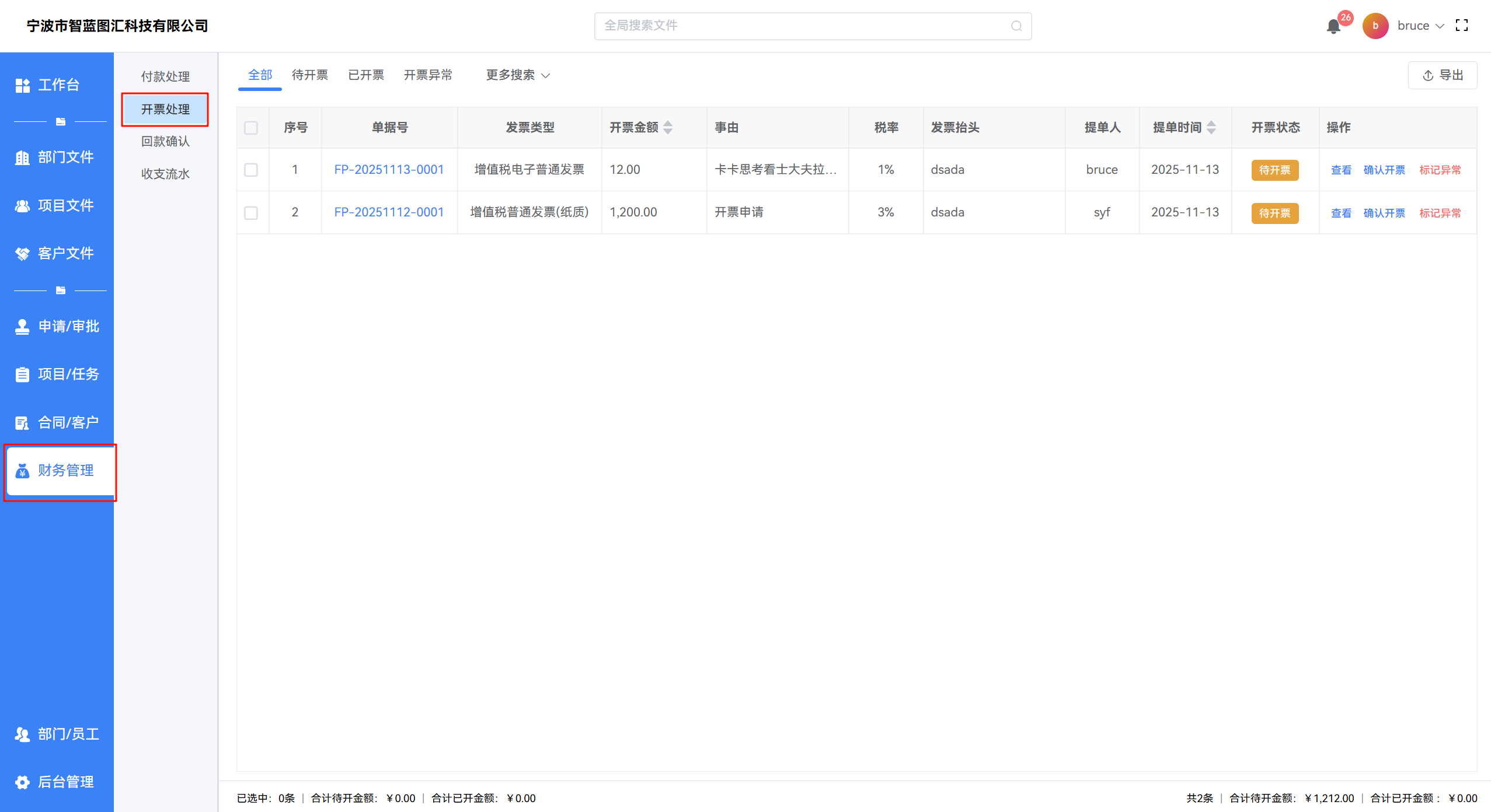 - 状态统计: 列表底部可查看不同状态的合计金额(待开票、已开票),便于财务掌握整体开票进度。