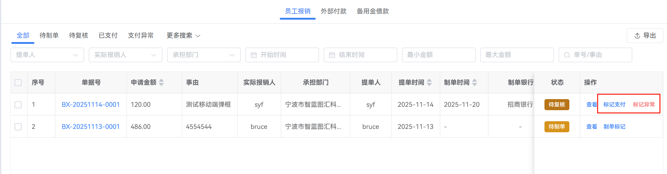 - 银行复核完成后,需要在系统中点击 标记支付 或 标记异常 按钮。