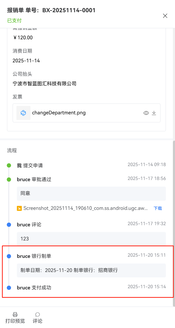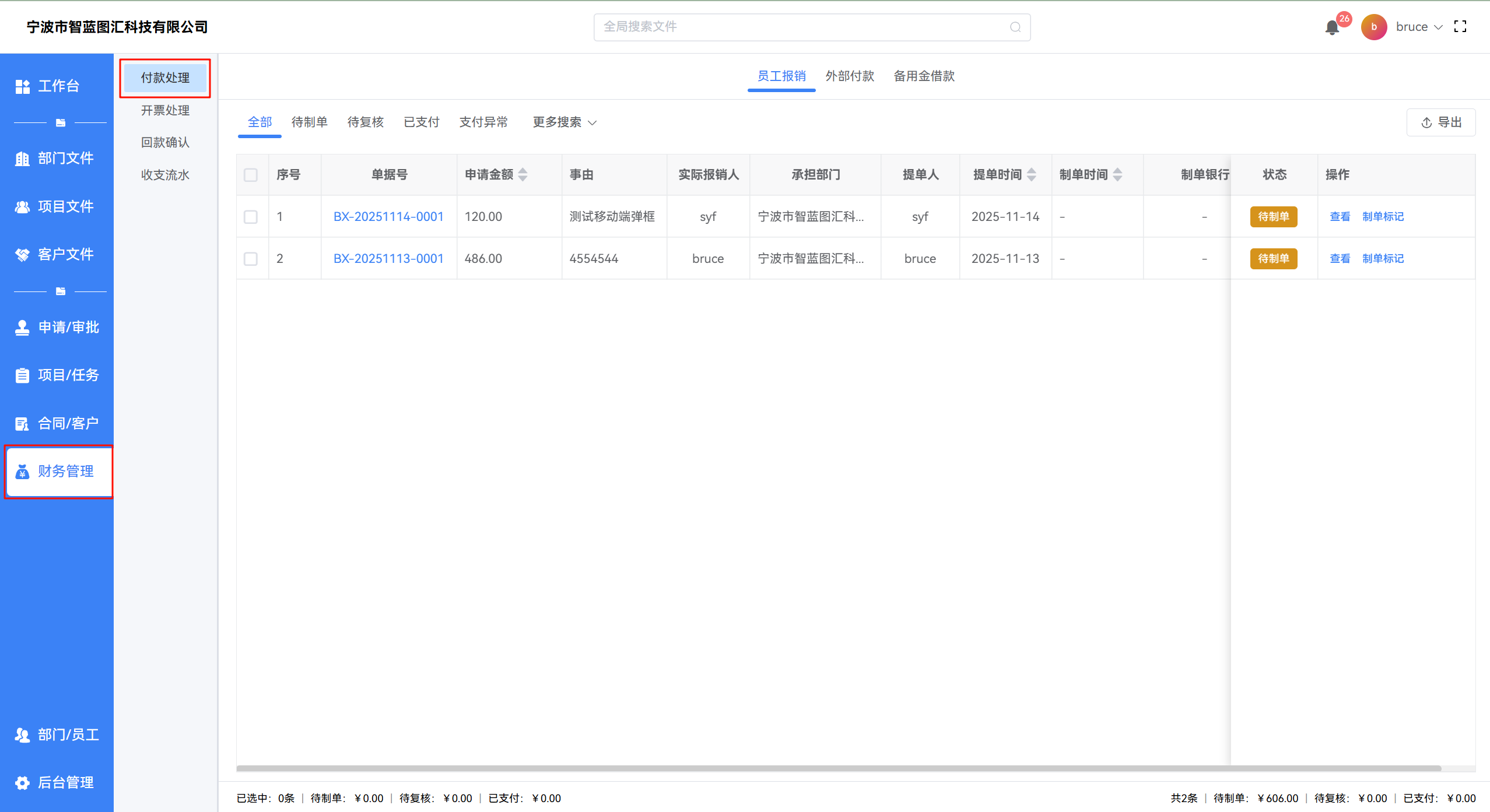 - 审批通过的单据进入付款处理中,需要出纳根据系统中的 待制单的单据 在银行端进行付款操作(制单)。