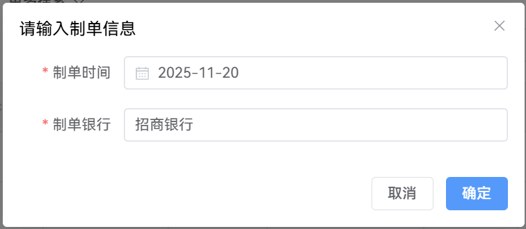 - 银行端完成制单后,需要在系统中点击 标记制单 按钮。 标记内容需要填写