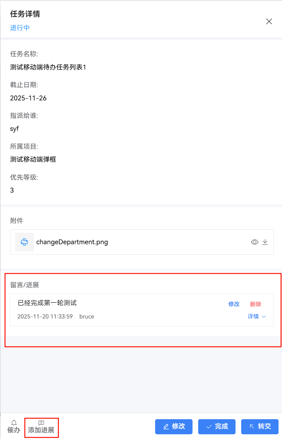 - 创建人、负责人及任务相关人员均可在任务详情页添加任务进展或留言