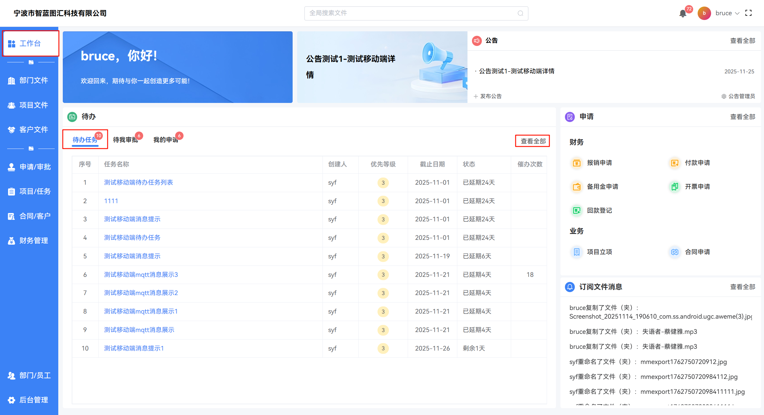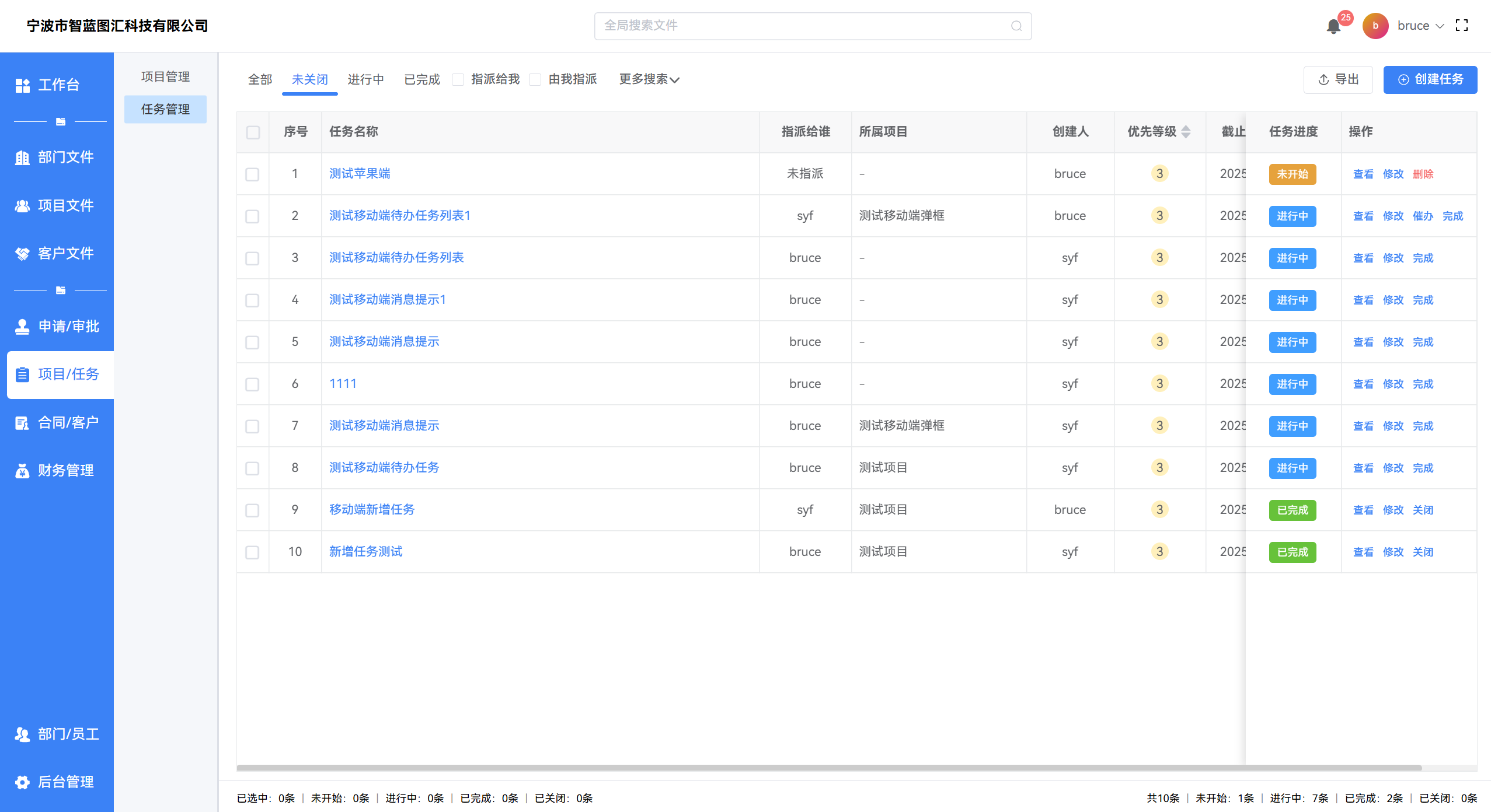 任务管理模块用于 统一管理公司所有任务的分配、执行和跟踪。通过系统化的任务管理,团队成员能够及时了解任务状态,负责人可第一时间接收通知并开展工作,创建人可随时 跟踪任务进度。