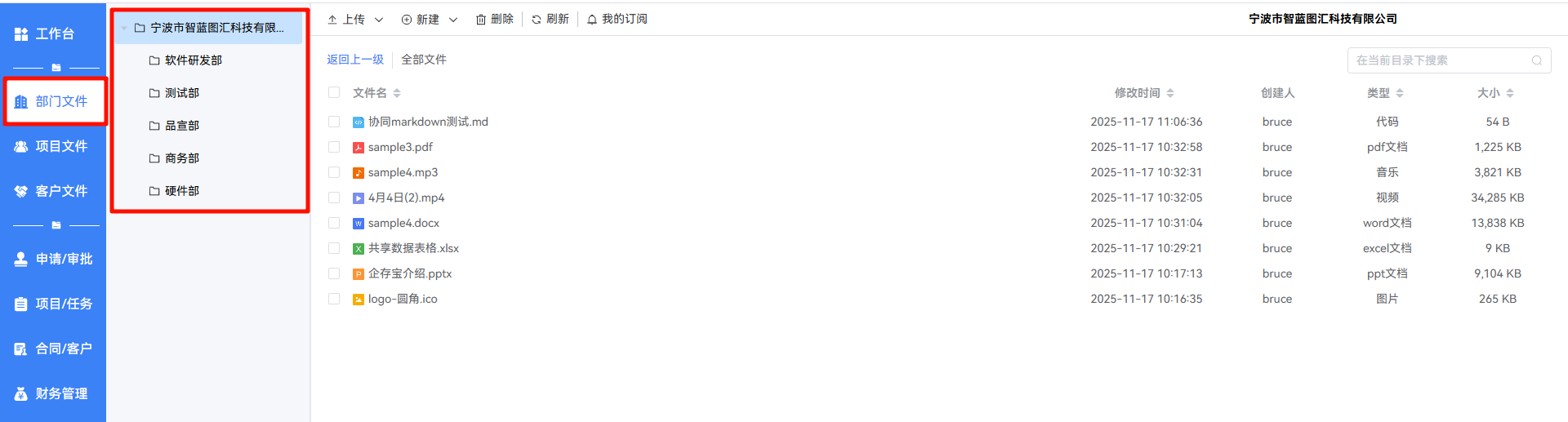 系统支持管理员对部门进行统一管理,包括部门 新增、删除、修改 和 调整顺序,并且部门的操作会同步影响部门文件空间。