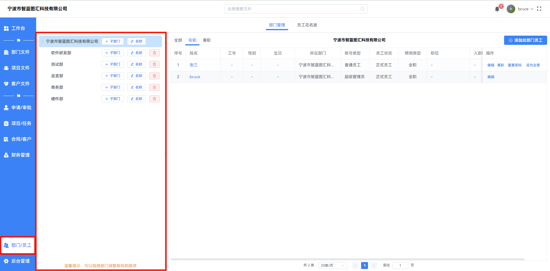 打开 【部门/员工】 菜单,左侧为部门管理,右侧为员工管理。