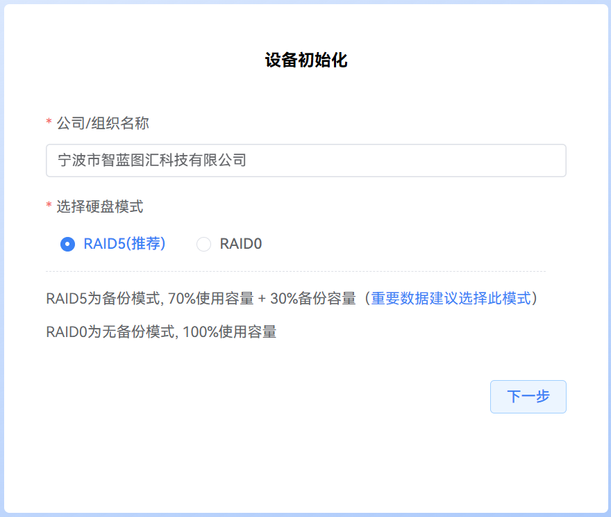 硬盘模式强烈建议选择 RAID5 模式,确保在硬盘故障时仍可修复数据。
