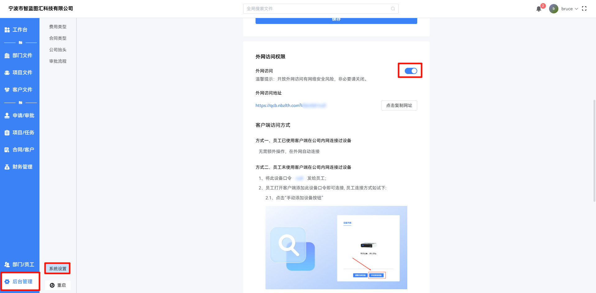 管理员可在 【后台管理 → 系统设置 → 外网访问权限】 中开启该功能: