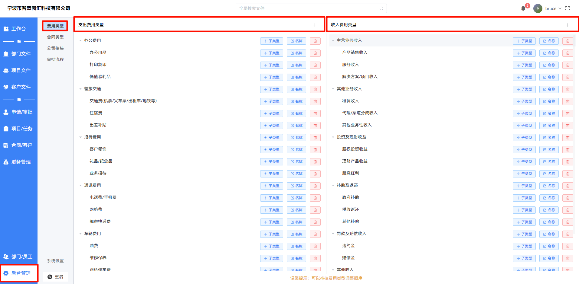 可以添加、删除、修改费用类型,也可以拖拽调整顺序。
