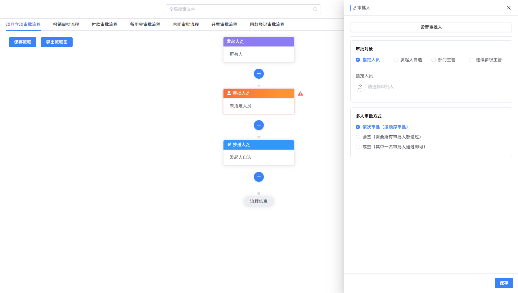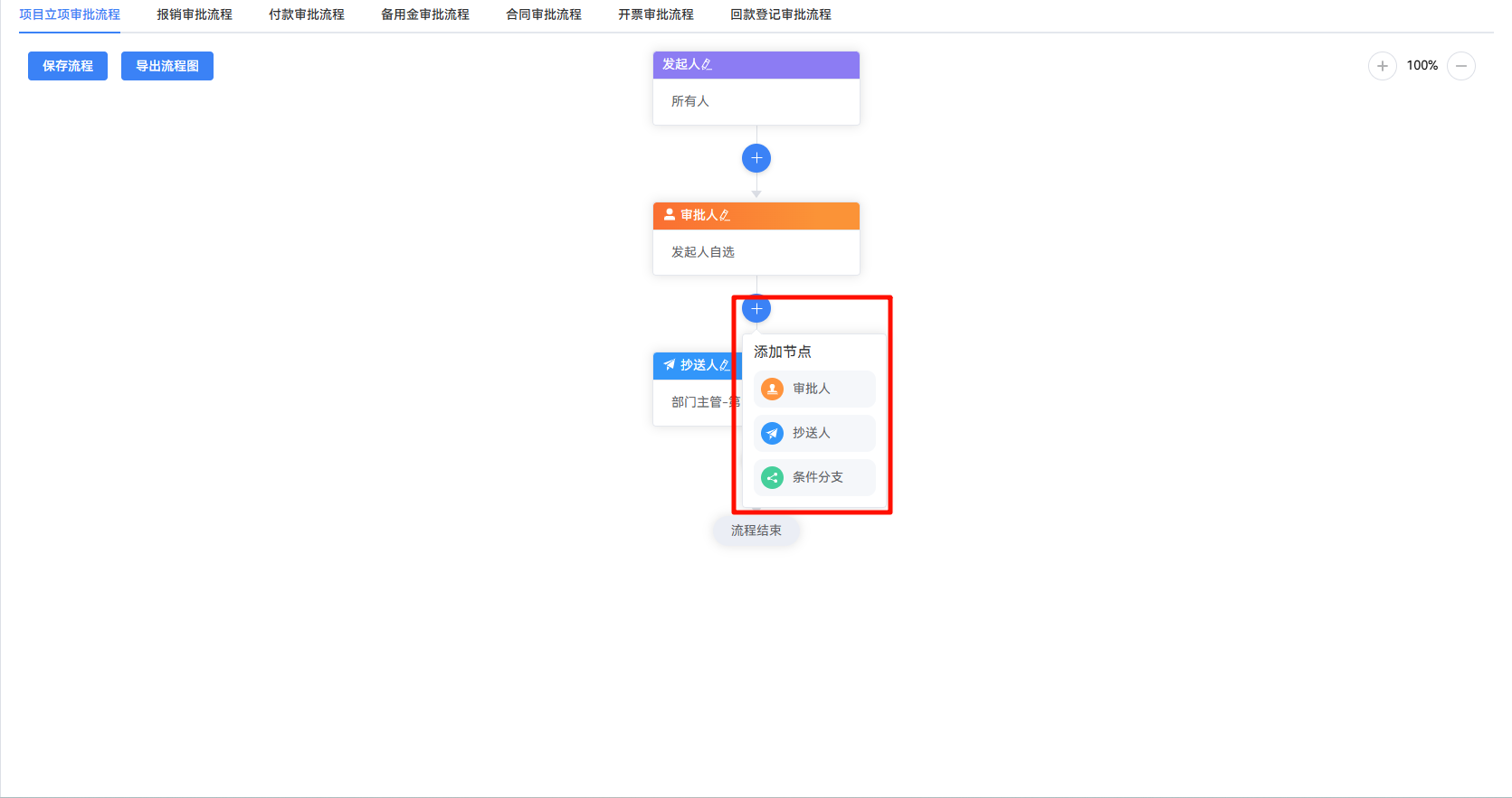 系统支持在审批流程中动态新增节点,节点包括 审批人、抄送人或条件分支,满足更灵活的流程配置需求。