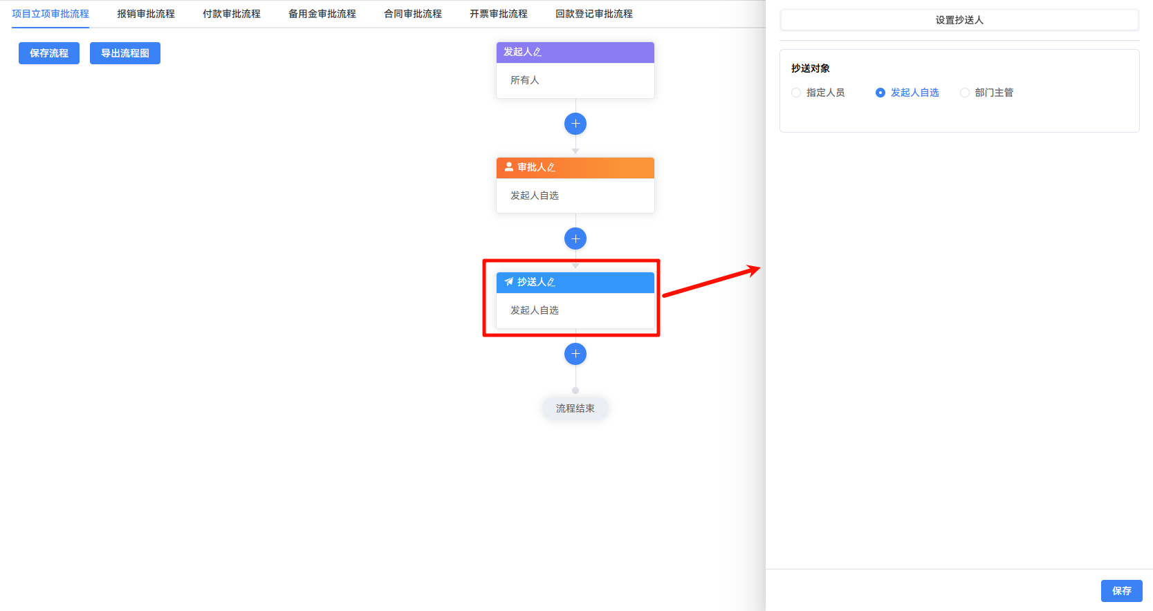 - 发起人自选(默认): 提交单据时,发起人自行选择抄送对象。