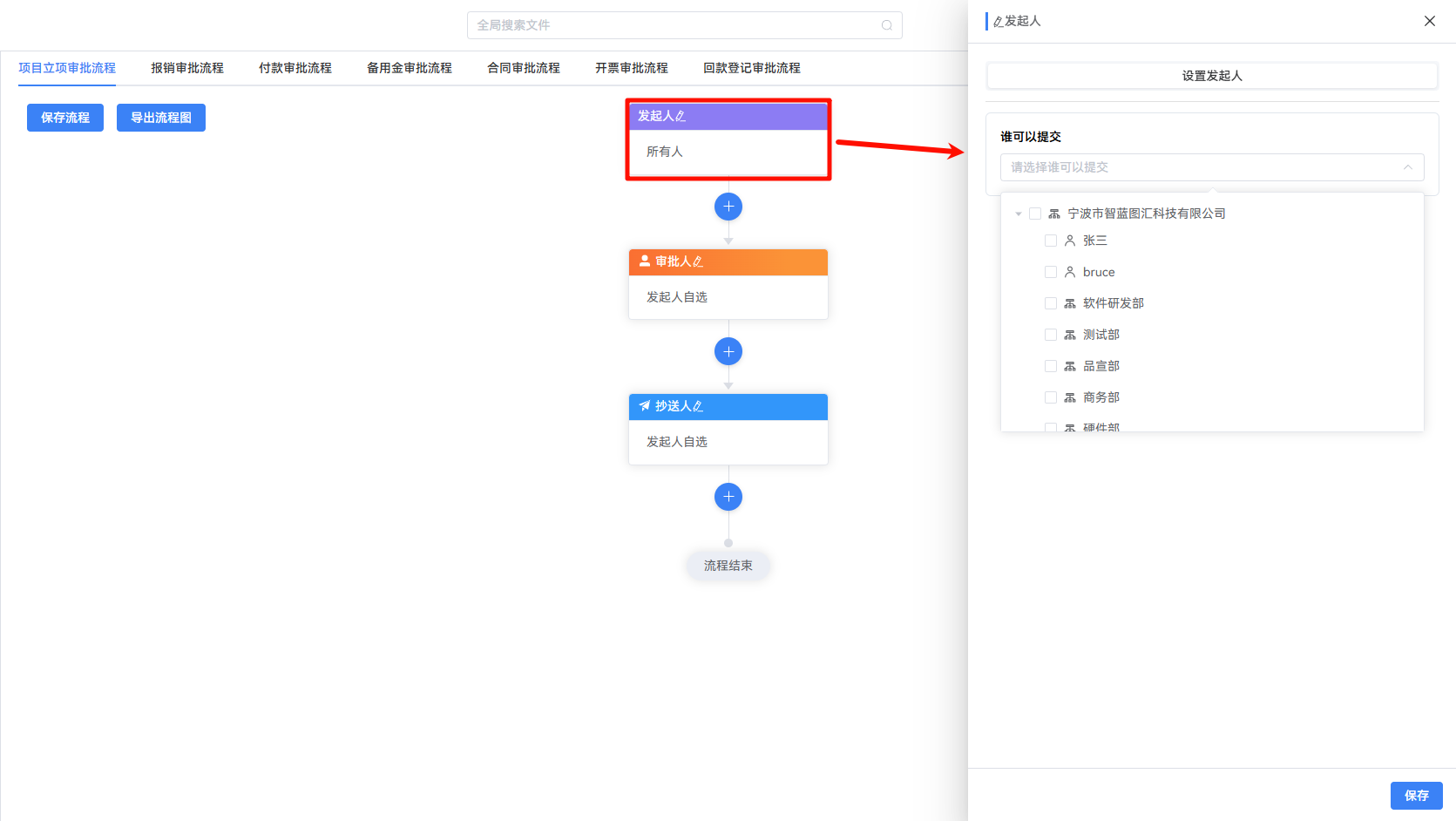 可设置允许发起流程的对象,包括指定 员工 或指定 部门。