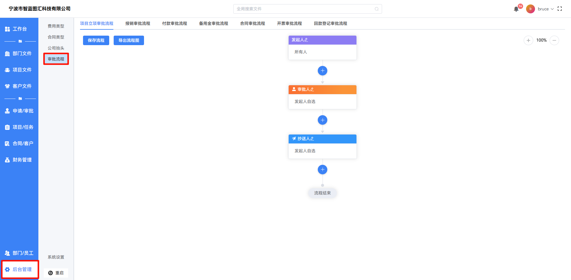 管理员登录系统后,可在 【后台管理 → 审批流程】 中配置各类流程。