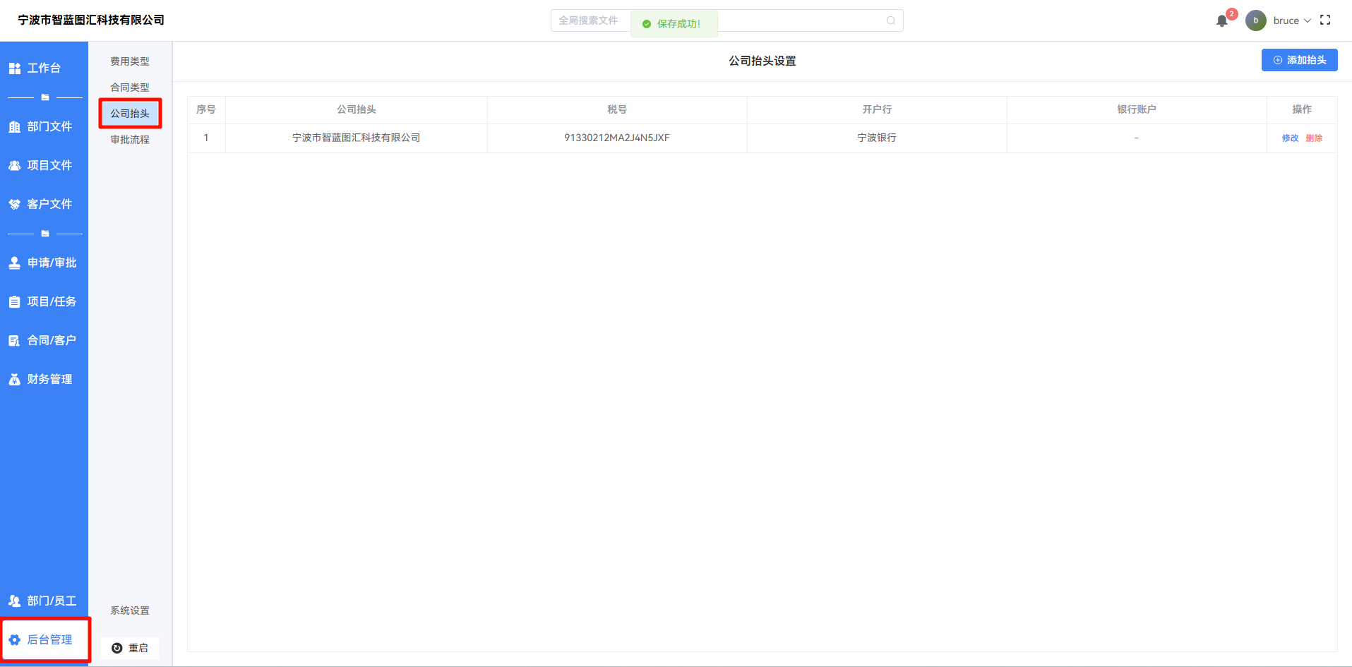 打开 【后台管理 -> 公司抬头】 菜单,即可进行公司抬头的 新增、修改或删除 操作。