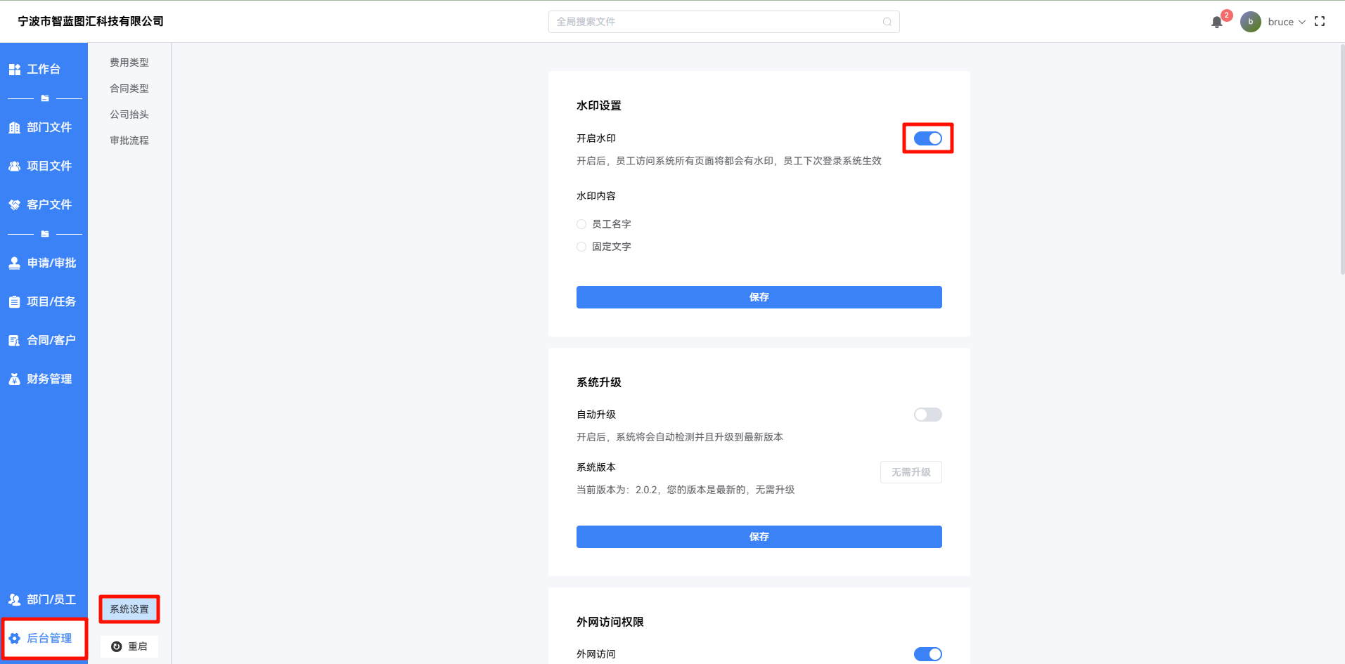 开启水印功能后,系统会在所有页面中显示水印内容。水印内容可设置为: